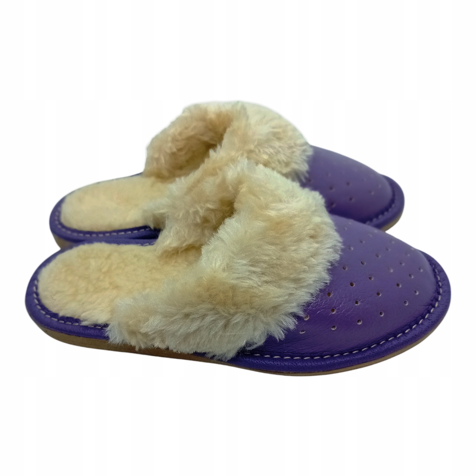Тапочки виготовлені з натуральної лакованої шкіри. Шкіра м'яка і приємна на дотик. Ажурний верх забезпечує хороший потік повітря. Чоботи оздоблені хутром, а шкіра прикрашена маленькими кружечками. Делікатне збільшення забезпечує стопі ідеальну амортизацію та запобігає її втомі. Підкладка утеплена овечою вовною, що забезпечує тепло і комфорт для ніг, завдяки чому шльопанці ідеально сидять на нозі, запобігаючи потертості або вологи, а нога не втомлюється під час ходьби. Підошва виготовлена з гуми (стирогуму), яка забезпечує чудове зчеплення устілки з землею, запобігає ковзанню та не залишає слідів на підлозі.