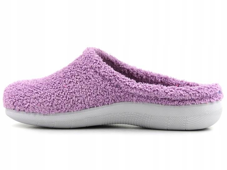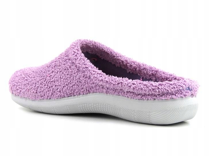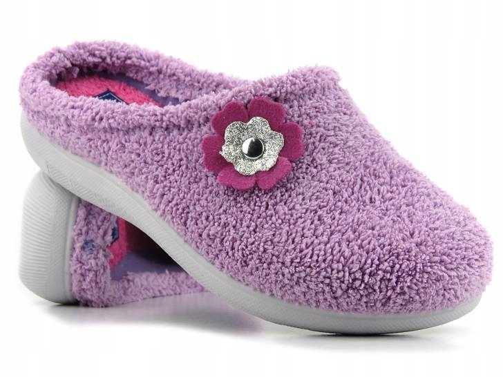 Фіолетові тапочки прикрашені ніжною квіткою.