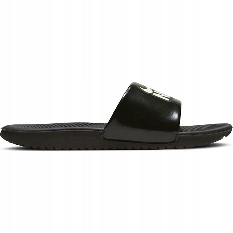 Дитячі шльопанці Nike KAWA FUN GS/PS чорного кольору з біло-зеленим принтом спереду, мають м’який синтетичний ремінець, який адаптується до руху ніжки дитини. Підошва виготовлена з м'якого і міцного поролону. Хвилясті вирізи на підошві дозволяють стопі рухатися природно. Нові оригінальні шльопанці. Чистіть відповідно до рекомендацій виробника.