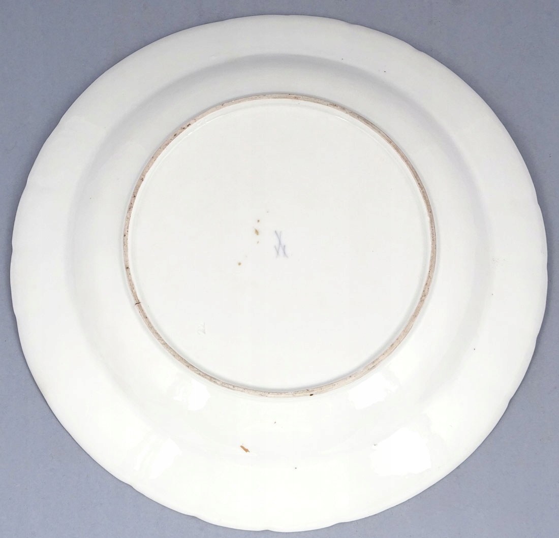 тарілка, з позолоченим рельєфом навколо комірця, з хвилястим краєм. У дзеркалі стоїть букет різнокольорових квітів і поодинокі квіти. На комірі в чотирьох полях, оточених позолотою, розташовані менші букетики квітів. Унизу підглазурне підписання кобальтом, два схрещені мечі та масовий відбиток «22».