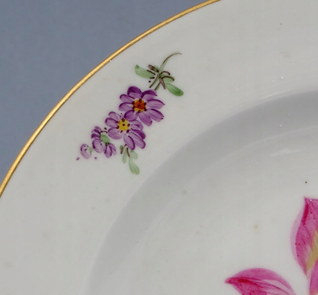 кругла плоска тарілка на комірці з трьома намальованими квітковими гілками та позолоченим краєм. Великий букет різнокольорових квітів у дзеркалі.