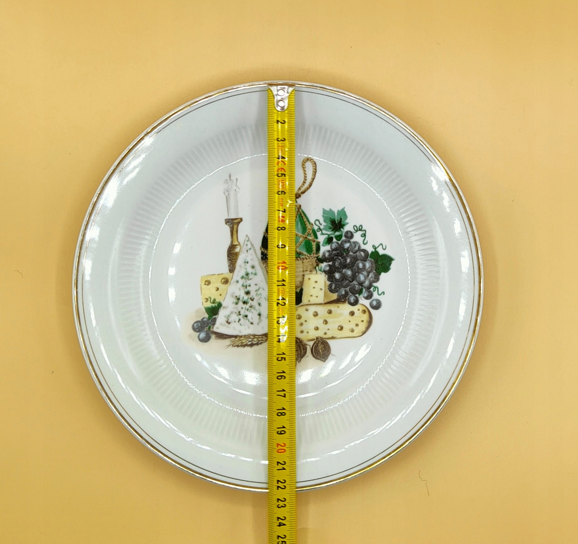 порцеляновий, діаметр 23,5 см, важить 420 г. Однак вінтажна тарілка, однак, немає тріщин і нерозумних, нічого не було відремонтовано, це все ще дуже приємно. Live представляє так само, як на малюнках, фотографії точні. Безумовно, корисна та колекціонерна тарілка.