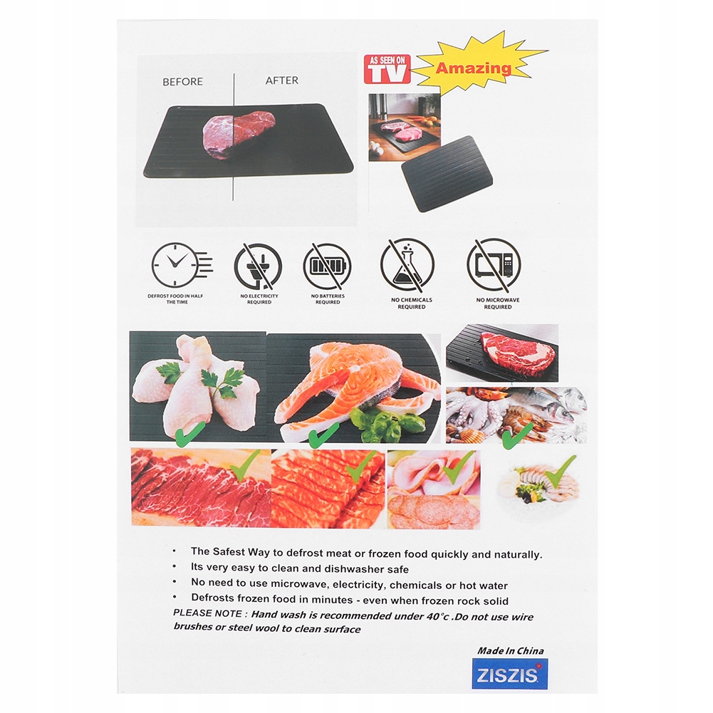 1. Наші тарілки для розморожування розморожують м’ясо, овочі та інші харчові продукти швидко, гігієнічно, природним і здоровим способом, без використання електрики, води, мікрохвильової печі чи акумуляторів, зберігаючи при цьому необхідні поживні речовини та вітаміни!