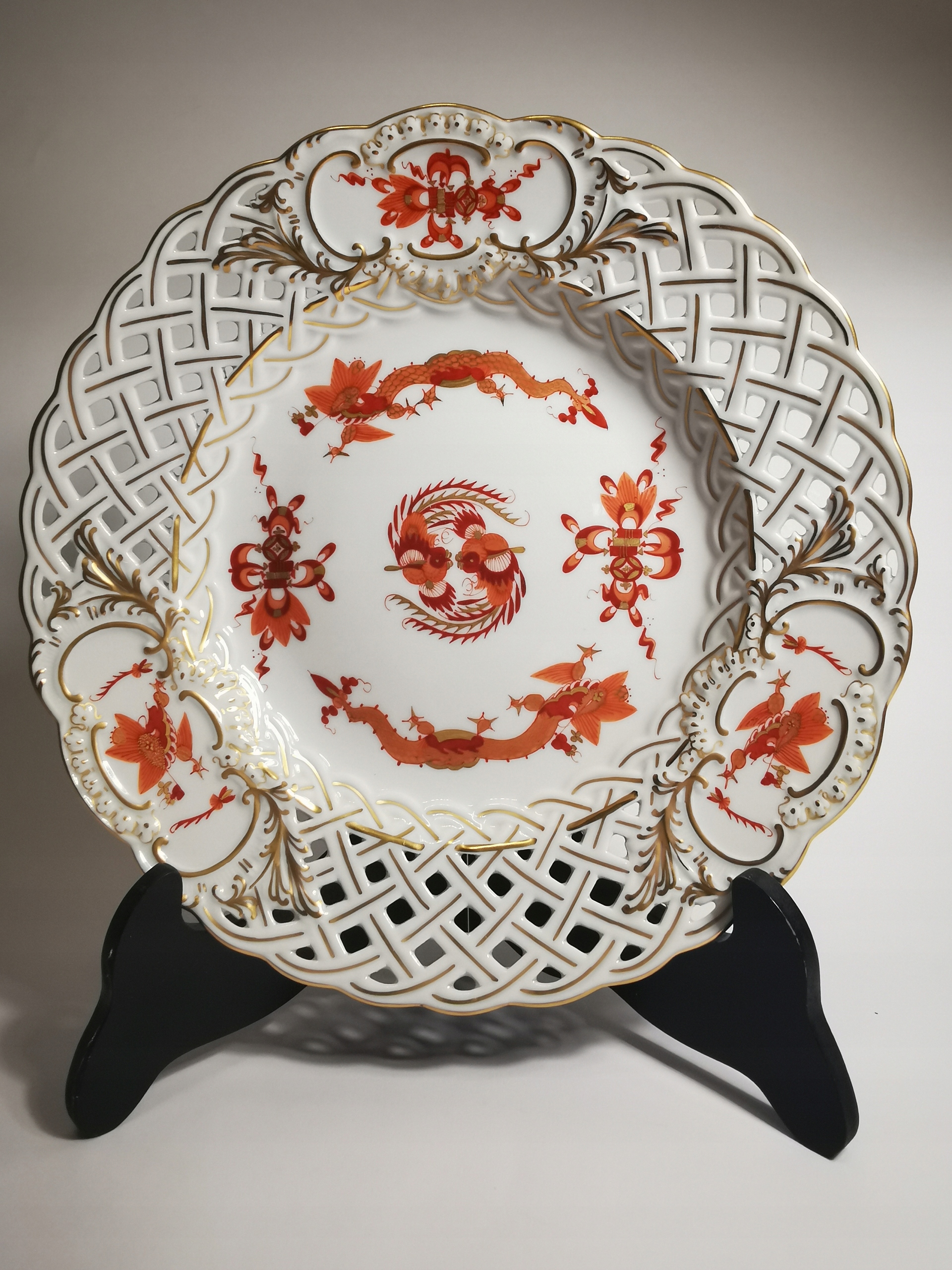 Представляємо феноменально красиву ажурну декоративну тарілку/тарілку, виготовлену з білої, глазурованої порцеляни найвищої якості, фабрики Meissen. Тарілка вручну розписана чудовим червоним візерунком «Hofdrachen» (драконовий двір), який до 1918 року виготовлявся виключно для саксонського королівського двору. У китайській культурі червоний дракон символізує процвітання, силу і хороший фен-шуй. Тож усі елементи до того часу використовували члени королівської сім’ї, особливо з 18 століття, оскільки тоді їх було менше.
