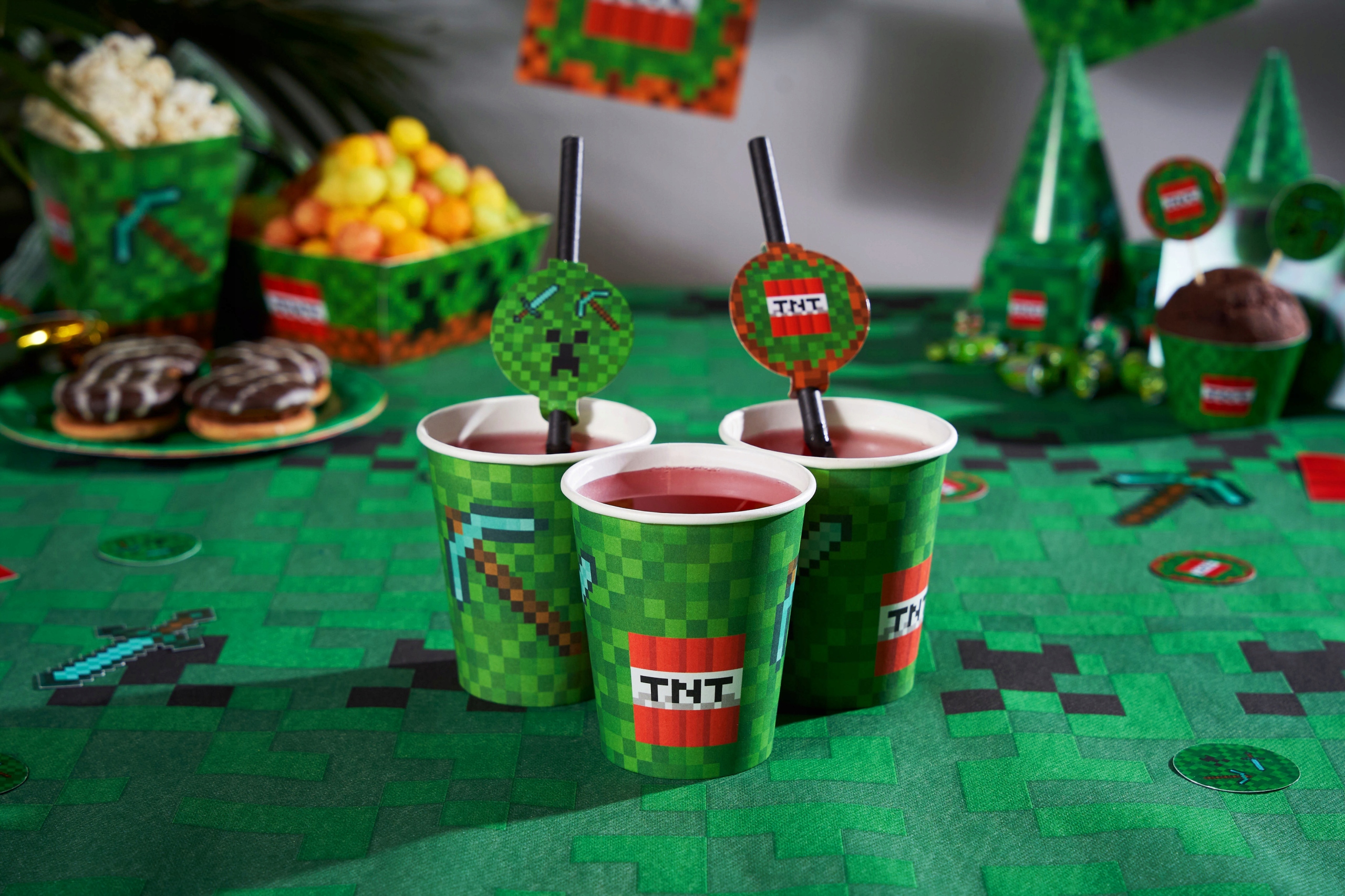 2️⃣ Themed table decoration - the pixel motif immediately creates the atmosphere of adventure