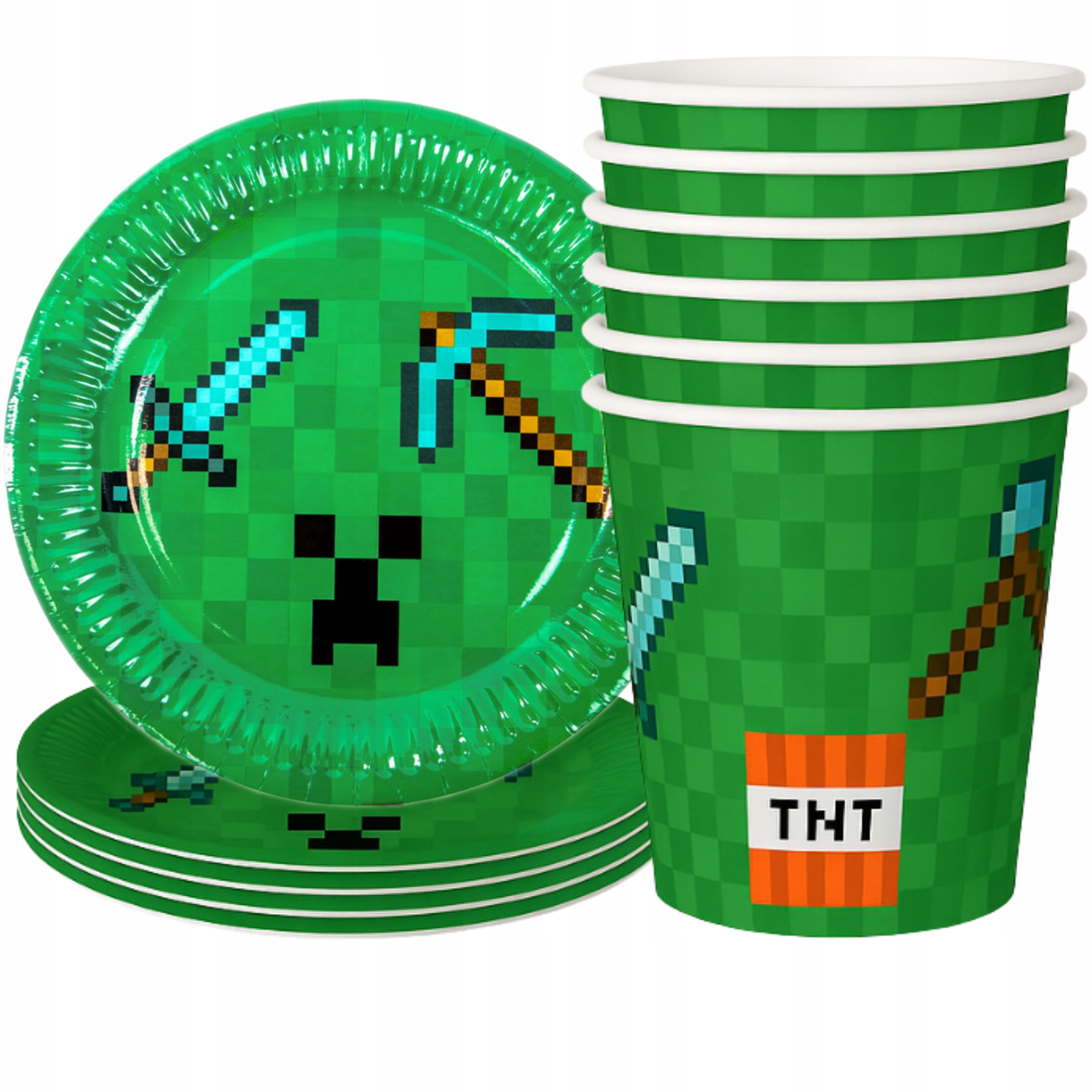 Ідеальний набір для шанувальників гри та піксельних пригод! Тарілки та чашки, натхнені світом Minecraft, - це чудовий вибір для дня народження, тематичної вечірки чи дитячої вечірки. Характерний малюнок з мечем, пікакссе, ТНТ та плазуна привертає увагу і створює унікальну атмосферу веселощів.