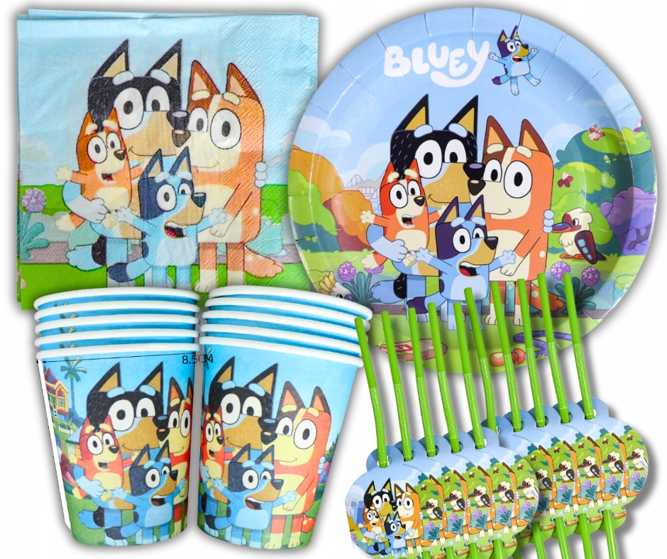 Ми також пропонуємо інші товари із серії Bluey: талісмани, кульки, топпери, гірлянди, кружки, серветки, фігурки та набори наклейок.