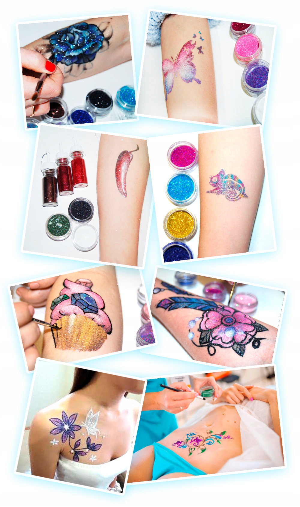 Технік гліттерного татуювання багато, наприклад, блискітки можна починати наносити лише після зняття трафарету, красиві дрібні деталі виділяйте окремим тонким пензлем, є на інших наших аукціонах. При творчому підході, використовуючи прості шаблони, можна зробити дійсно неймовірно красиві, чудово сяючі малюнки на тілі.