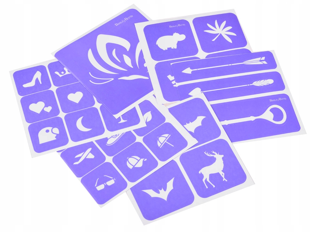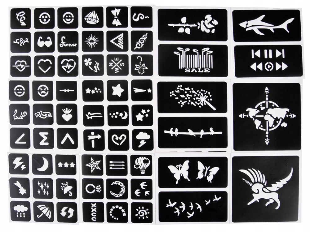 - 18 аркушів із десятками шаблонів гліттерних татуювань різного розміру,