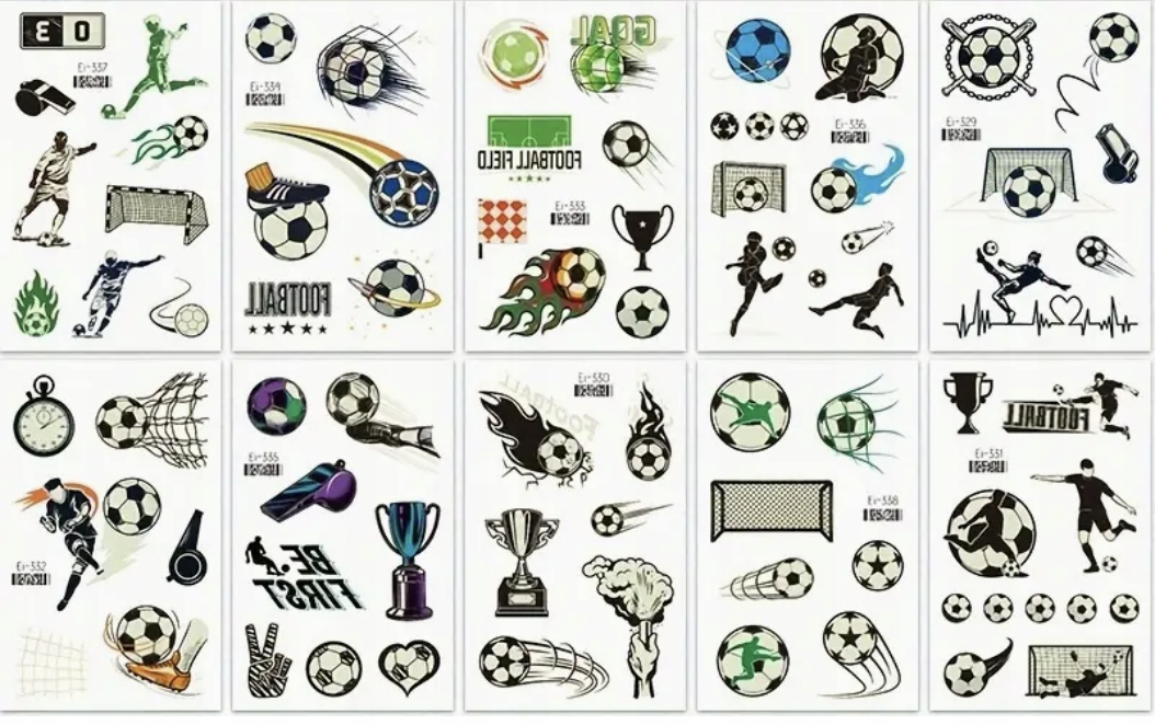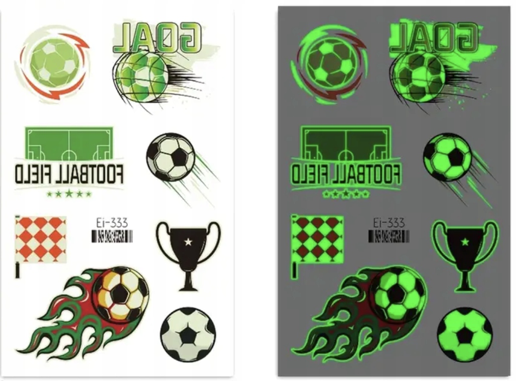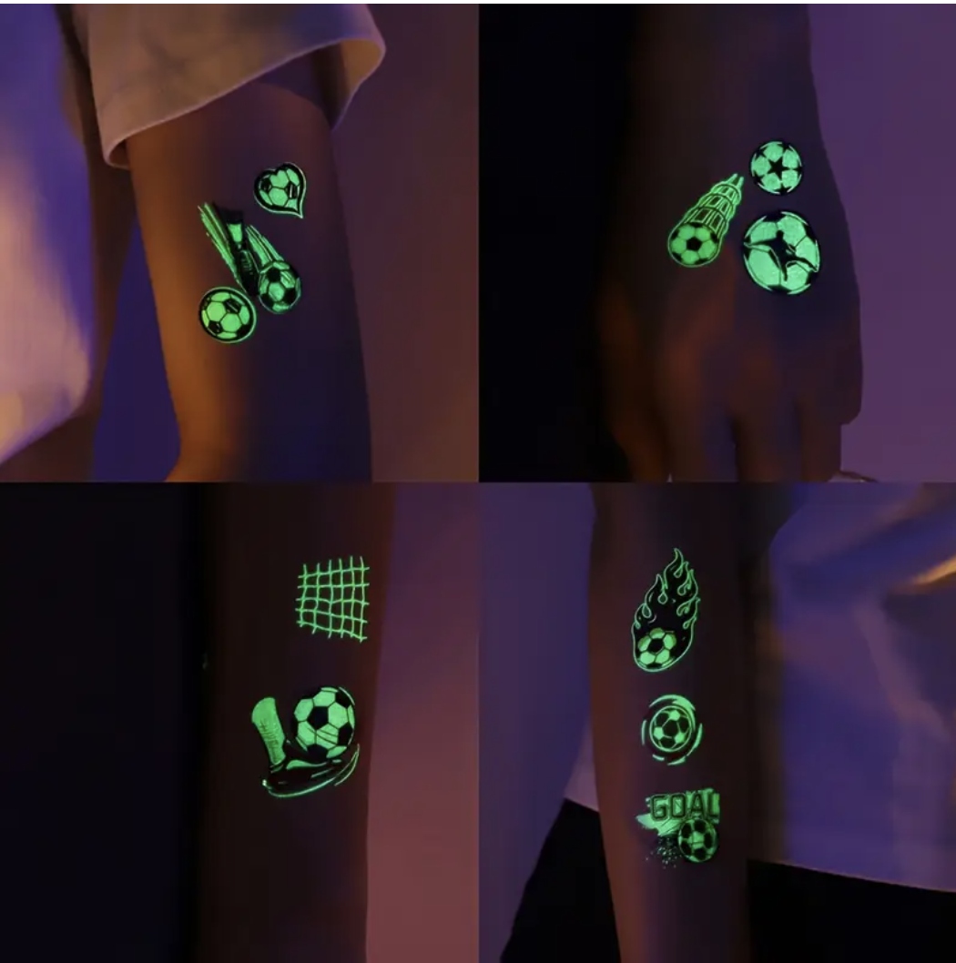 Відкрийте для себе світ веселощів із нашими кольоровими татуюваннями для дітей, які можна мити, які світяться в темряві! Ці унікальні татуювання зображують футбольні мотиви, які подобаються маленьким спортивним уболівальникам.