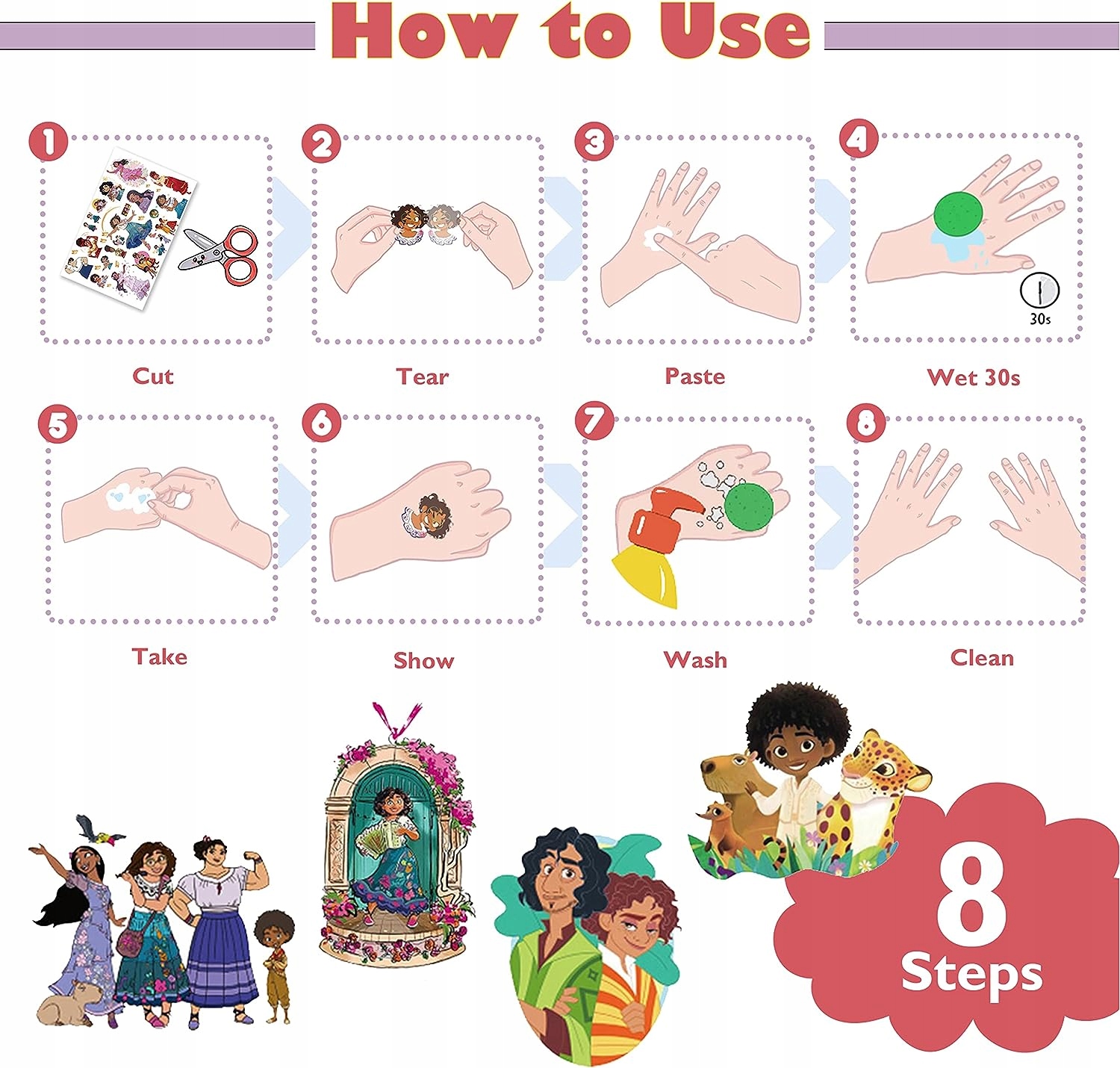 8 аркушів Чарівні тимчасові татуювання для дітей, Encanto День народження Сувеніри для вечірок Encanto для дітей Хлопчики Дівчата Вечірні ігри Подарунки Мультяшні татуювання Наклейки Чарівні прикраси для вечірок.