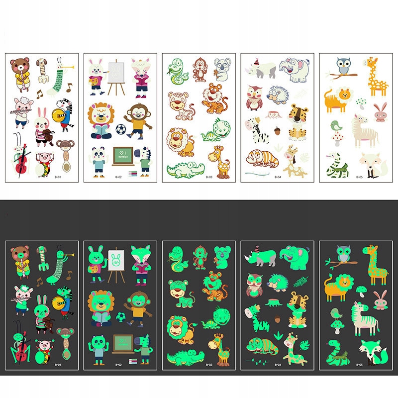 блискучі та блискучі: Ці світиться наклейки на татуювання з тваринами роблять сяючий малюнок, який буде світити і демонструвати пишність флуоресцентних кольорів, а освітлюючий ефект триватиме кілька годин кожного разу, коли ви запалите їх, що допоможе вам блищати в натовпі та забезпечить вам хороший досвід, легко здобути популярність серед дітей.