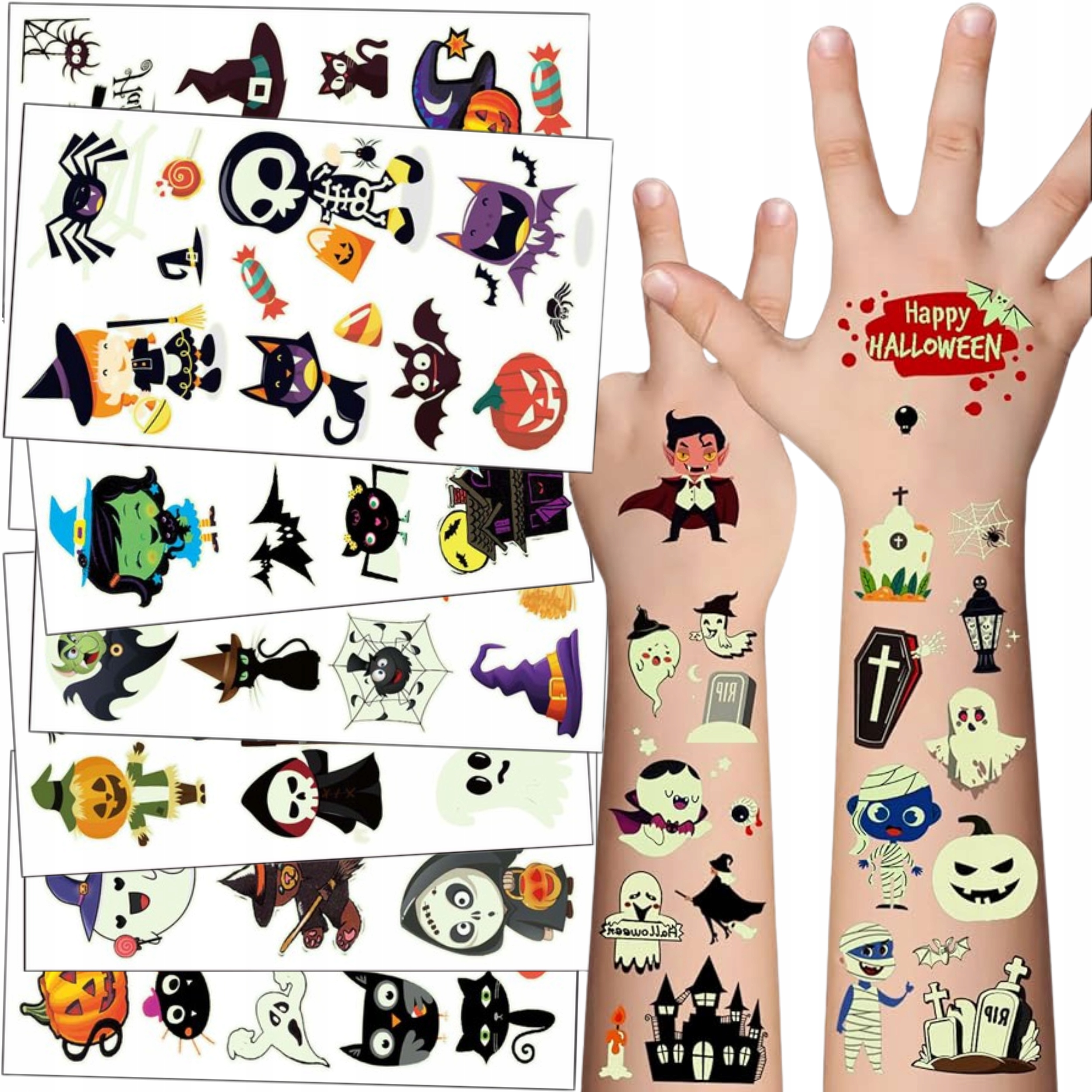 Татуювання ідеально підходять для прикраси тіла під час Хелловіну, а також можуть використовувати як невеликі подарунки для гостей. Здивуйте своїх друзів оригінальними татуюваннями, які світяться після настання темряви та створюють моторошну атмосферу!
