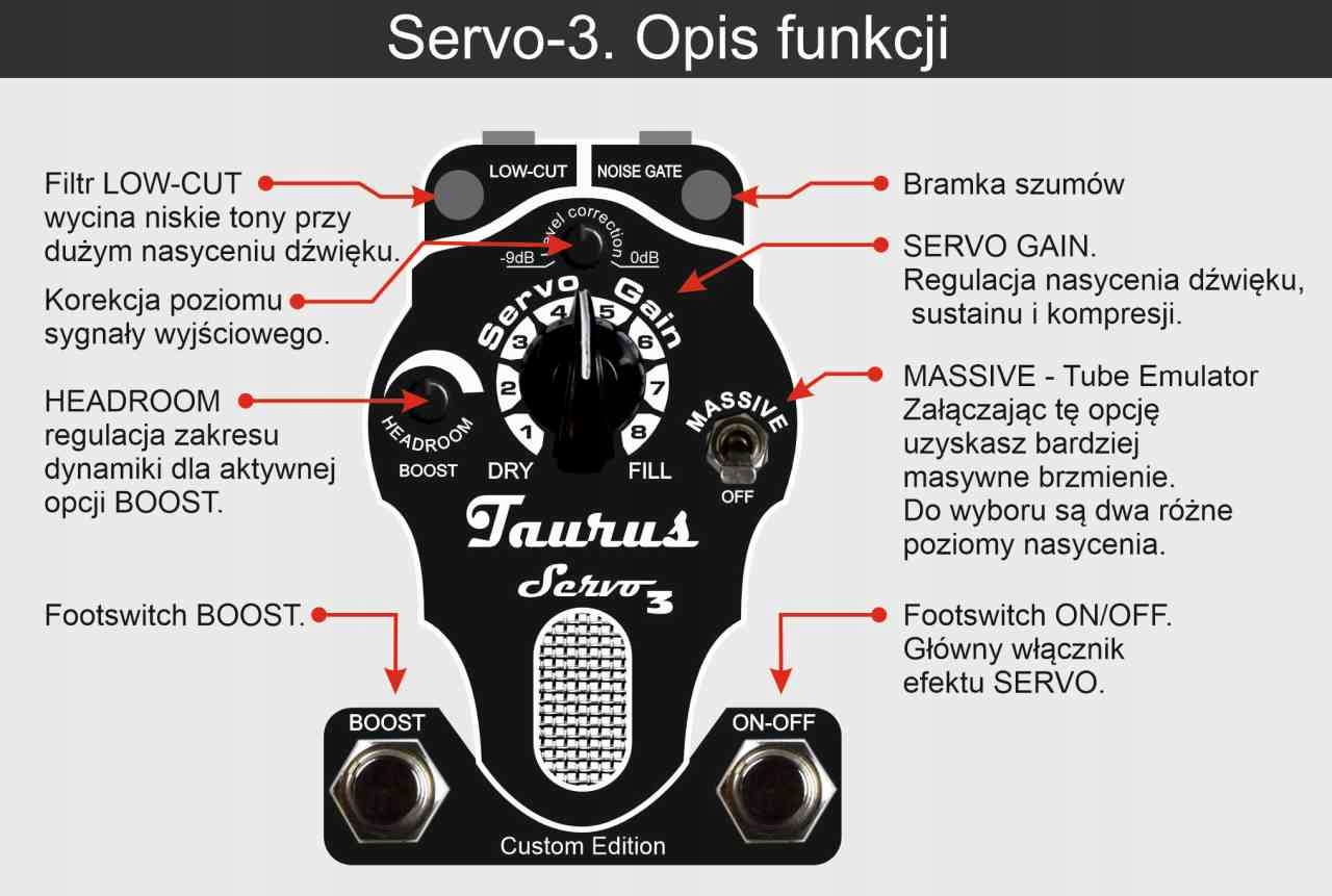 Власна версія Servo-3 заснована на аналоговій ламповій схемі. Він має секцію BOOST, яка активується педальним перемикачем. Функція BOOST не просто підвищує рівень звуку. BOOST також представляє специфічний, трохи хижий характер звуку CRUNCH.