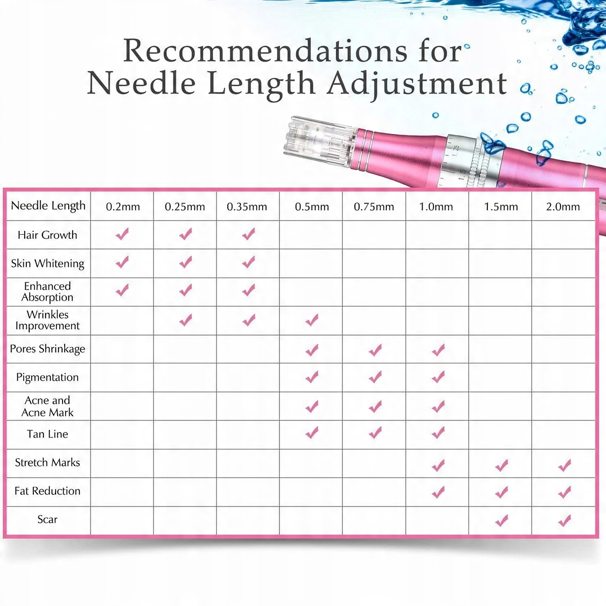 【7 режимів краси】 Dermapen має 7 регульованих рівнів швидкості (від 6000 до 24000 об/хв). , тож ви можете вибрати відповідну купюру та довжину та чітко бачити купюру на РК-екрані.