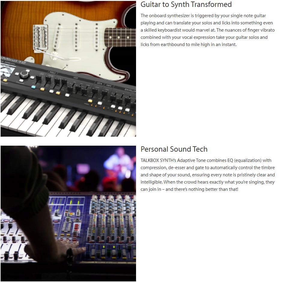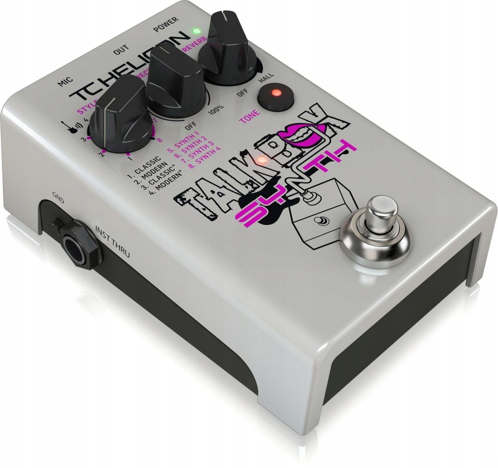 Talkbox Synth від TC-HELICON-це процесор вокальних ефектів, що контролюється гітарною гітарою, укладеною в металевому корпусі, забезпечуючи чотири стилі ефектів Talk Box та Synth Sounds. Група ефектів бокс-боксу-це не що інше, як моделювання відомих ефектів, оснащених довгою трубкою, кінець якого гітарист помістив у рот і модулював їх у роті-дякую, щоб TC-гелікон Цей маленький гігієнічний виступ повільно стає минулим. Talkbox пропонує класичний режим, сильно насичений, нагадує звук ефектів від 70 -х, чистіший сучасний режим, нагадування ефектів вокатора та їх версії Classic+ та Modern+, де додається сигнал гітари, що веде для ефекту співу унісон з гітарою. Синт-режими-це кольори роботи роботи, що відрізняються за формою хвилі, але всі вони контролюються звуками гітари.