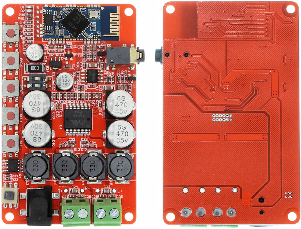 Імпульсний аудіопідсилювач, стерео, з потужністю 2x25W при 8Ω та джерелом живлення від 8 В постійного струму до 20 В постійного струму. В основі модуля лежить мікросхема TDA7492P. Підсилювач виконаний в класі D, що забезпечує хорошу якість посилення. Модуль має вбудований Bluetooth 4.0, модель BTM835. Він має вбудовані роз’єми клемної колодки, які дозволяють зручно підключати кабелі гучномовців. Блок живлення можна підключити до гнізда DC 2.1/5.5, а до JACK 3.5mm лінійний вихід без підсилення. Модуль оснащений кнопками: PLAY/STOP, BACK, NEXT, VOL+, VOL-і діодами, що вказують на стан Bluetooth.