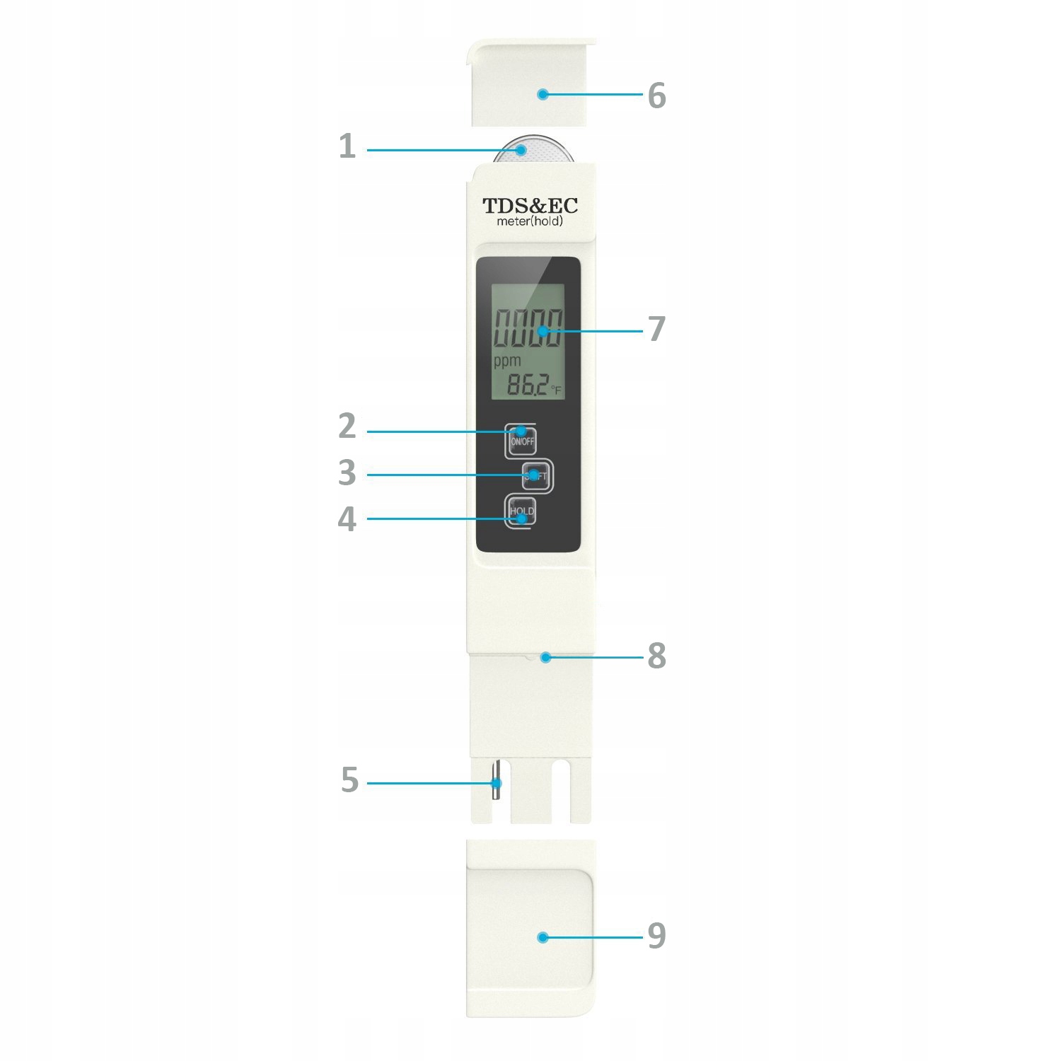 • Вимірювання загальної кількості всіх речовин, розчинених у воді (ppm), провідності (мкСм) і температури (°C)