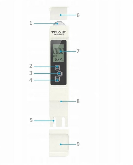 - Вимірювання загальної кількості всіх речовин, розчинених у воді (ppm), провідності (мкСм) і температури (°C)