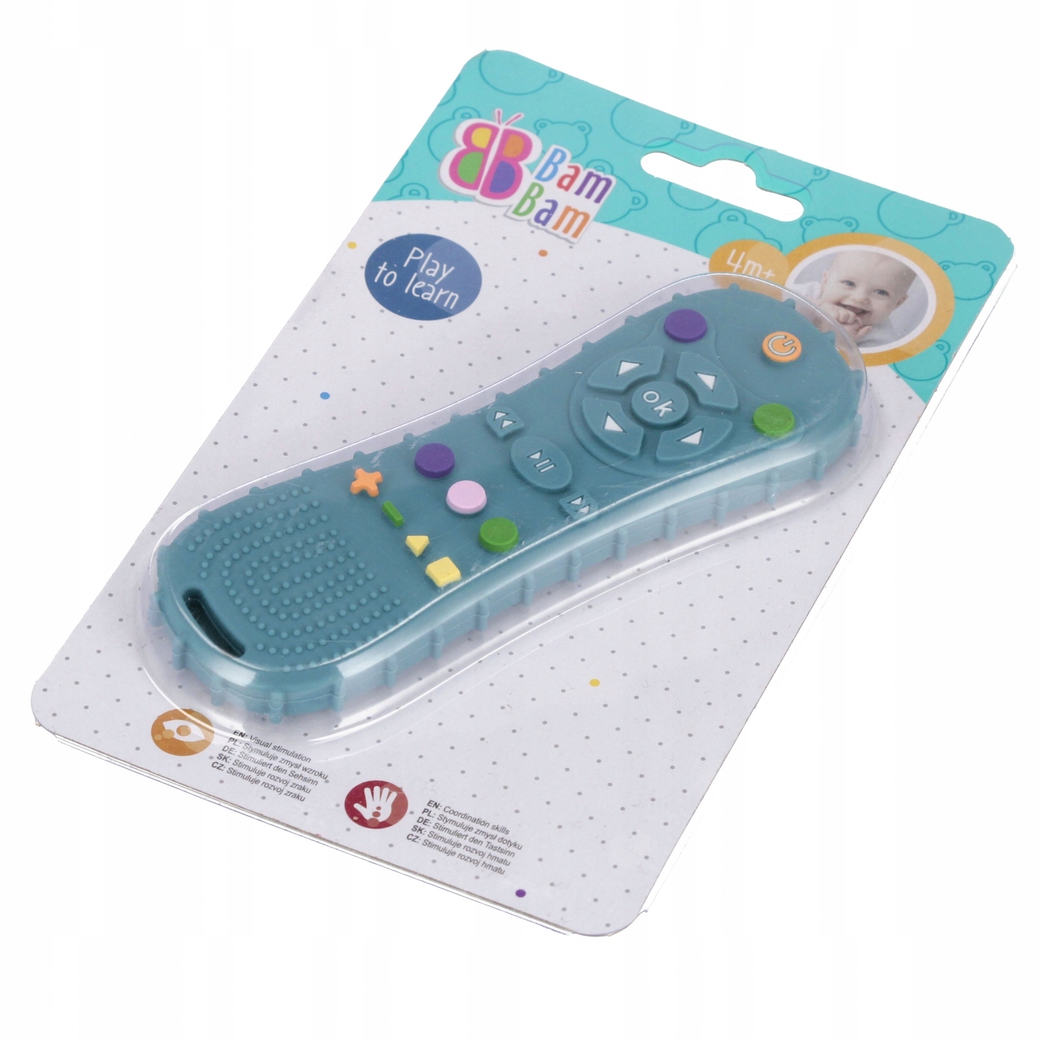 зуби Bam Bang - це ідеальна іграшка, яка ідеально працює в період прорізування зубів. Барвисті та м'які вкладки у формі кнопок на пульті дистанційного керування ідеально підходять для кусання, що приносить полегшення до болю в яснах дитини. Різні кольори стимулюють сприйняття дитини та почуття зору. Нерегулярні форми, безсумнівно, впливають на розвиток ручних здібностей. Збалансована форма ідеально вписується маленькими руками. Іграшка, виготовлена з вищої якості гуми без фталатів, відповідно до EN-71 та CE, забезпечує безпечну забаву. Розміри/вага/акумулятори: Розміри продукту довжина x висота x глибина см: 5x15x1, розміри упаковки довжина x висота x глибина см: 14x20x2, вага продукту КГ: 0,06 кг, вага продукту в упаковці кг: 0,09 кг, не потребує живлення акумулятора. TEETHER, призначений для дітей у віці 4 м. Іграшка упакована на блістер. У колективному картоні, упакованому після 188 предметів