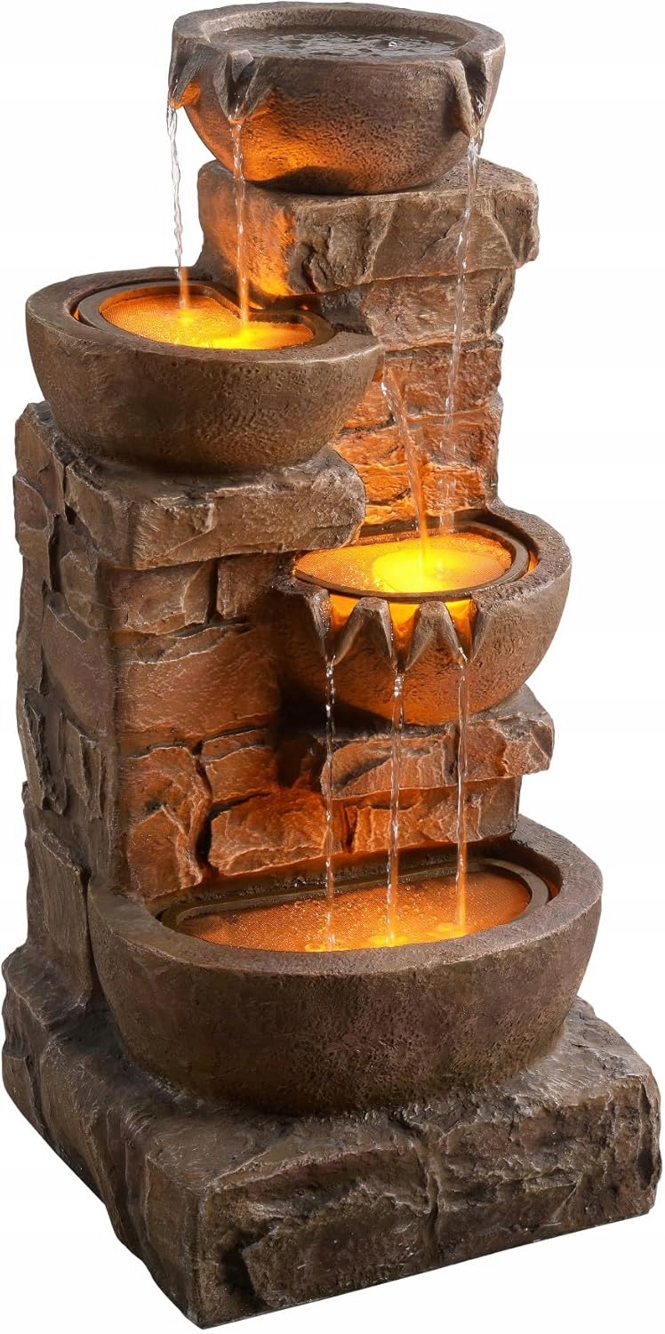 - Звук води акуратно впадає в ряд каскадних мисок, розміщених на розташованих скелях, тоді як світлодіодні світильники безпечно знаходяться під водою під водою цього зовнішнього фонтану з водою