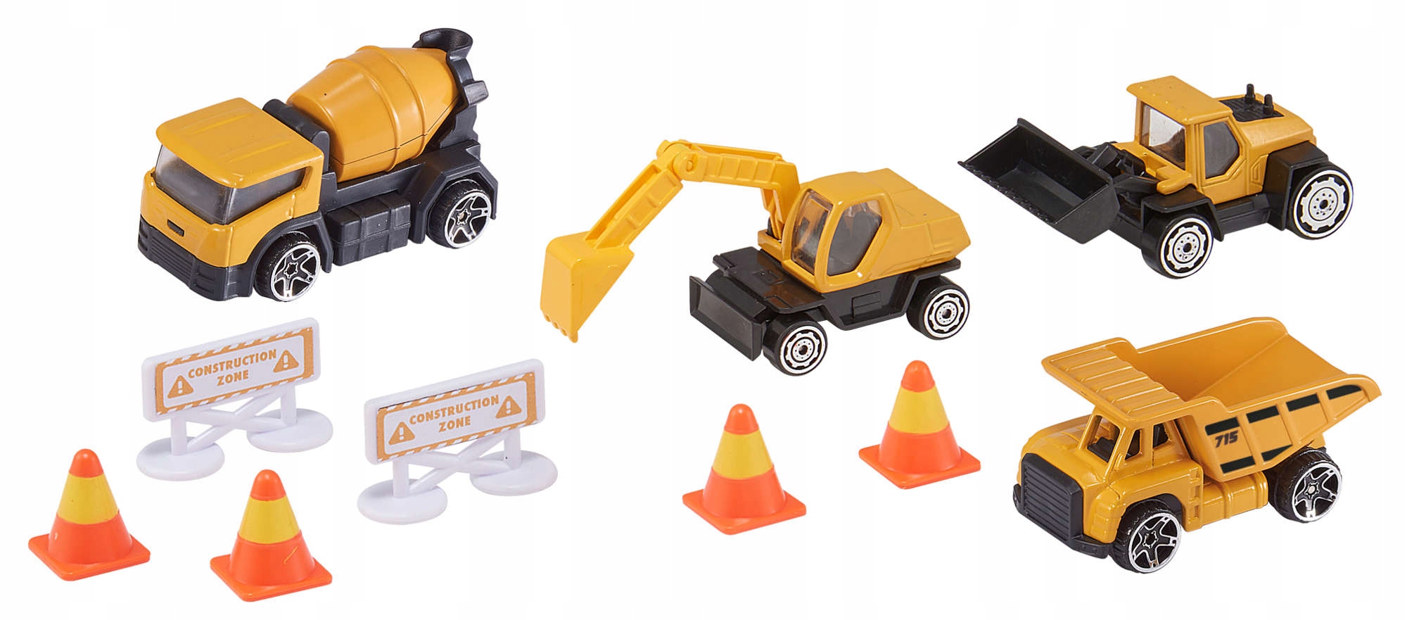 Набір складається з 4 будівельних машин: самоскида, бетономішалки, екскаватор і бульдозер, а також чотири пости і два персонажа. Транспортні засоби виготовлені з металу та пластику.
