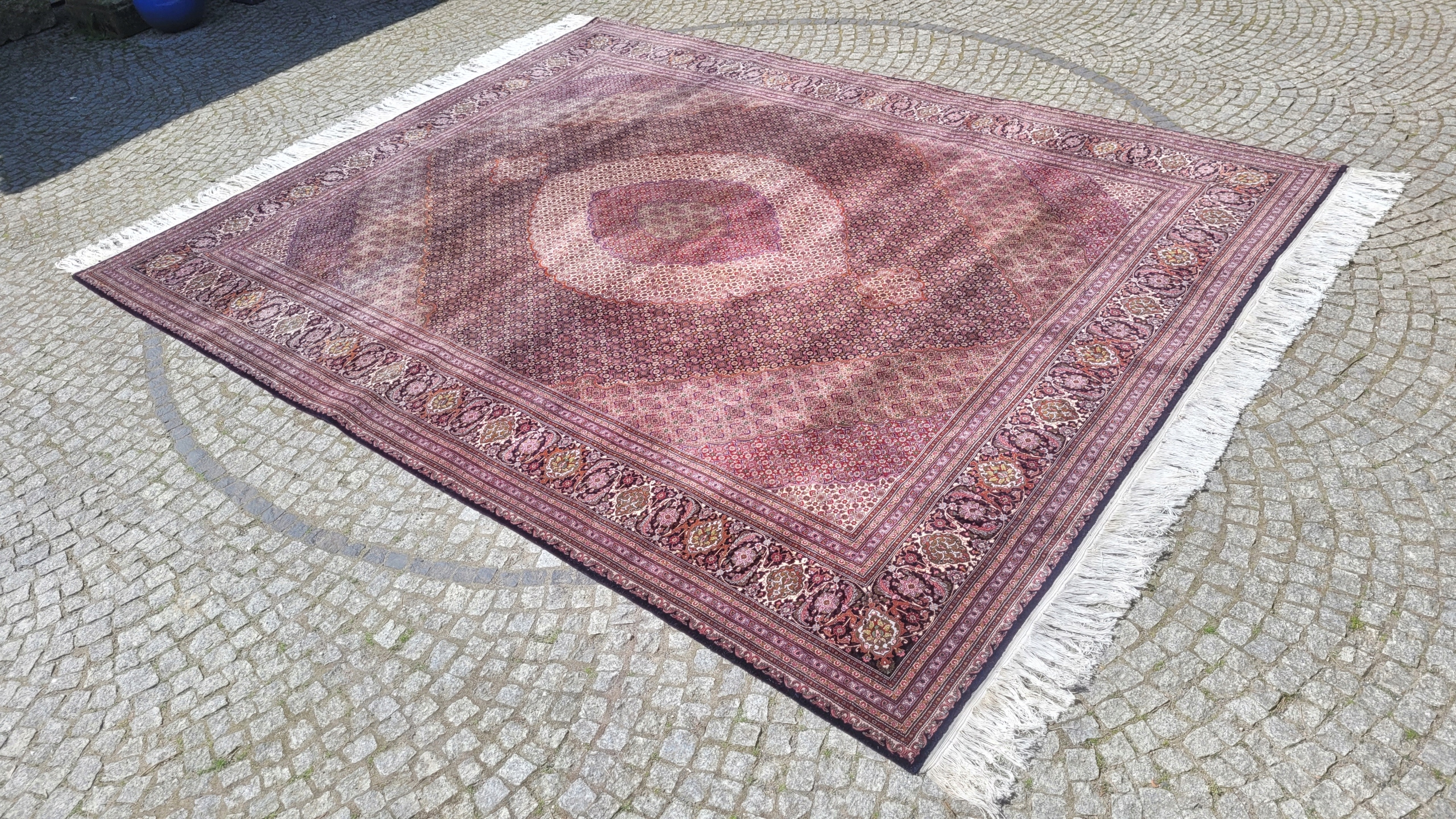 Перський килим з автографом Tebriz Mahi Raj 80. Пробка ручної роботи з вовни найвищої якості з додаванням шовку. Характеризується компактним, приємним на дотик флісом і красивими кольорами та візерунками. У дуже хорошому стані, видно на фотографіях.