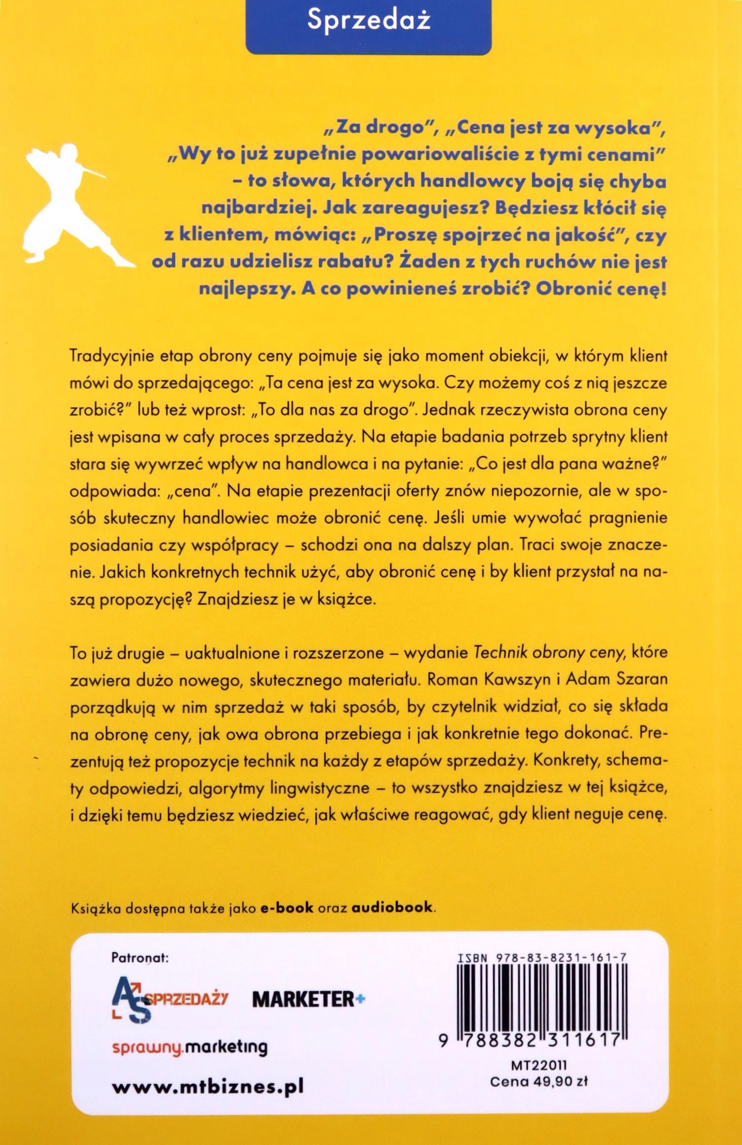 Традиційно стадію захисту ціни розуміють як момент заперечення, коли клієнт каже продавцеві: «Ціна занадто висока. Чи можна з нею зробити щось інше?» або просто: «Для нас це надто дорого». Однак фактичний захист ціни є частиною всього процесу продажу. На етапі дослідження потреб розумний клієнт намагається вплинути на продавця і питання: «Що для вас важливо?» відповідає «ціна». На етапі презентації пропозиції продавець знову може непомітно, але ефективно захистити ціну. Якщо він може викликати бажання володіння або співпраці, він відходить на другий план. Він закінчується. Але які конкретні методи ми повинні застосувати, щоб захистити ціну і змусити клієнта погодитися на нашу пропозицію? Ви знайдете їх у цій книзі.