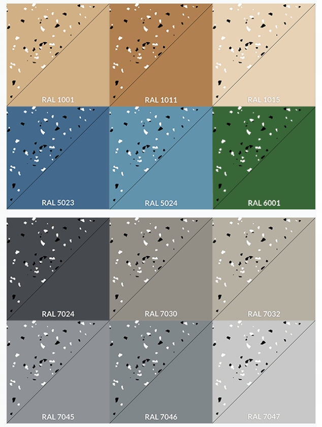 Доступні кольори: RAL: 1001, 1011, 3009, 6021, 7001, 7030, 7032, 7040, 7045, 7046, 7047, 1021, 1015, 6001, 6011, 7035, 8017, 9003, 90 05, 5024 , 3001, 5023, 7024, 7038
