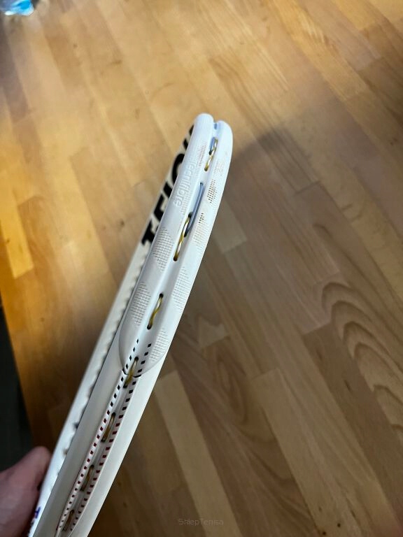 Ракетка в дуже хорошому стані. На фото видно невеликі сліди використання, що означає зміну кольору на помаранчевий через гру на грунтовому корті. Ракетка має струни: Solinco Tour Bite and Head RIP Control 1.25 з навантаженням 24,5 кг на 01.03.24. Додатково була намотана нова верхня обмотка.