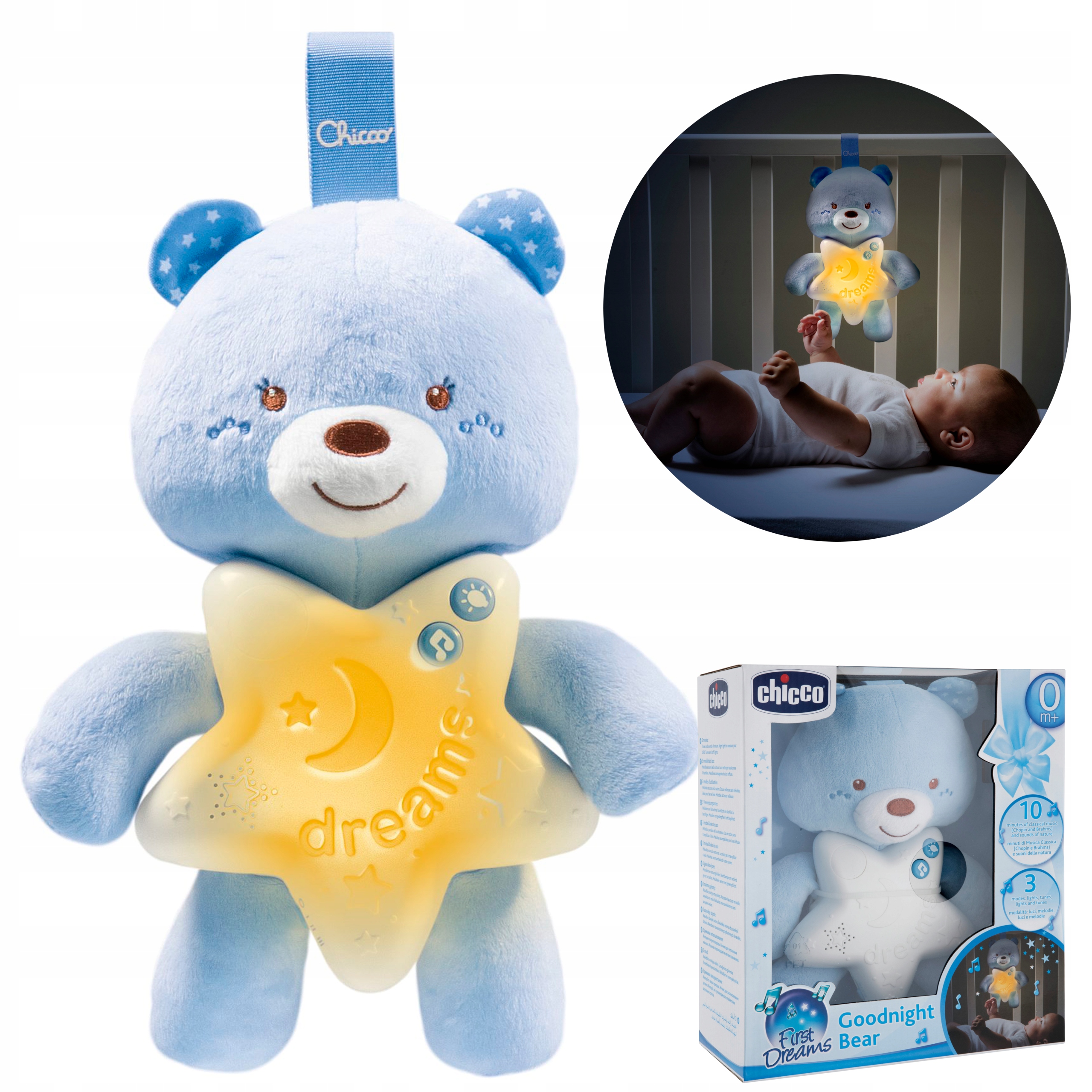 Плюшевий ведмедик Chicco не лише випромінює світло, а йвідтворює різноманітні звуки, які допомагають заспокоїти дитину перед сном. Він пропонує 10 хвилин спокійних класичних мелодій, таких як твори Шопена та Брамса, а також звуки природи, такі як шум хвиль або спів птахів.
