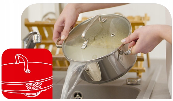 Два типи отворів у кришках розроблено для легкого зливання як великих інгредієнтів, таких як макарони, так і менших, напр. рис. Все це для ще більшого полегшення приготування їжі та зменшення потреби в мийці.