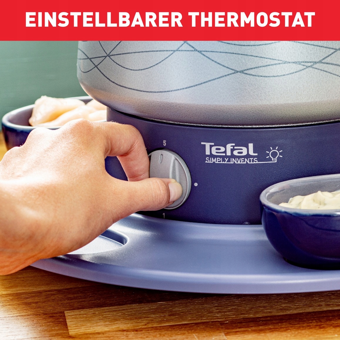 Створіть приємний вечір миттєво. Цей електричний набір для фондю підходить для приємних моментів для 8 осіб. Встановлений на обертову тарілку, що містить 8 виделок для фондю та 5 відповідних мисок, задоволення від фондю гарантовано. Регульований термостат і каструля з антипригарним покриттям дозволяють готувати фондю з оливковою олією, сиром або шоколадом, індивідуально адаптовані до ваших потреб і легко миються. Покриття особливо міцне і запобігає горінню. Усі знімні частини можна мити в посудомийній машині.