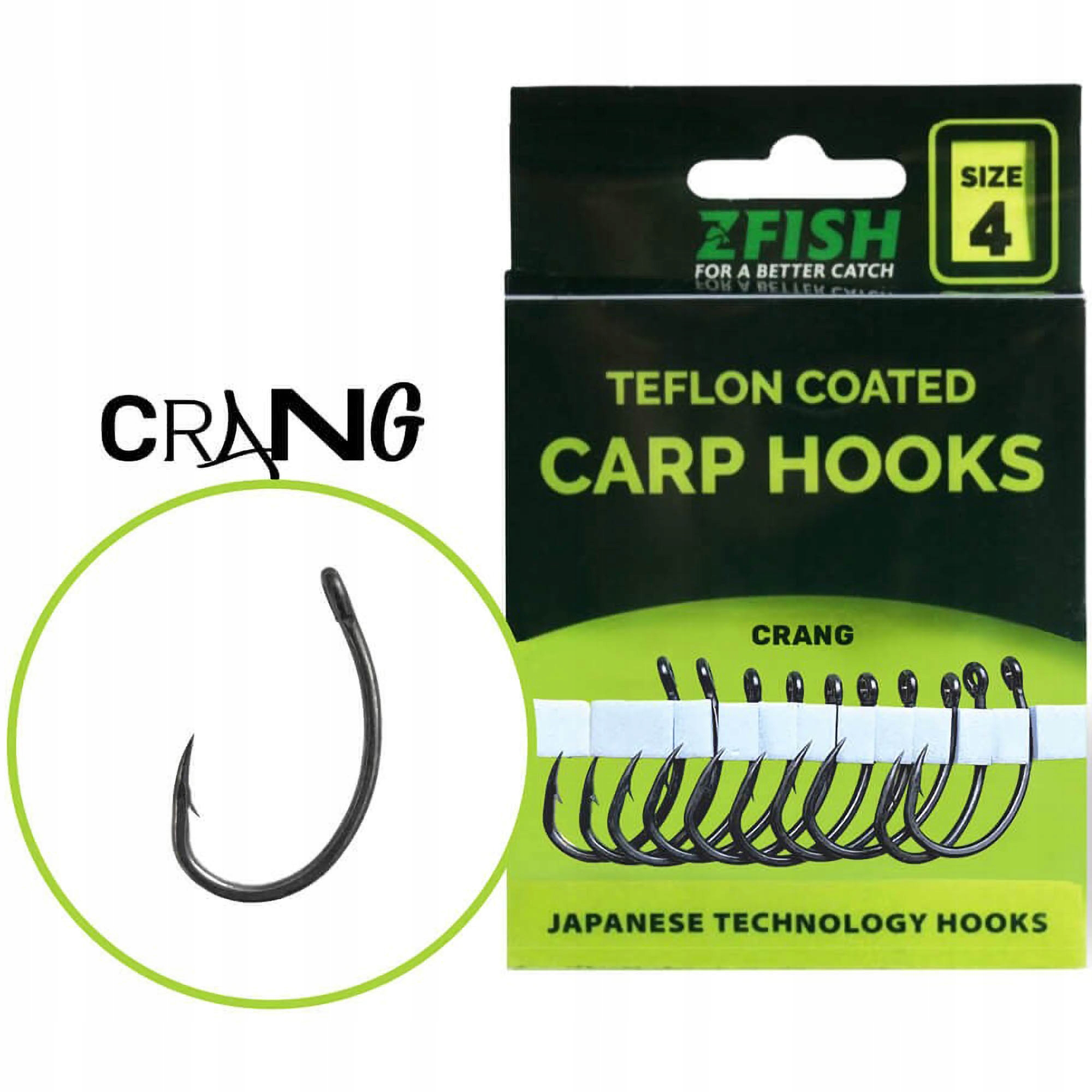 Популярний чеський бренд ZFISH представляє абсолютно нову лінію тефлонових гачків найвищого класу під назвою "CRANG". Завдяки використанню найсучасніших матеріалів і точної японської технології виробництва досягнуто максимальної гостроти кінчика і загальної високої міцності самого гачка. Ці тефлонові гачки спеціальної форми задовольнять своїми властивостями і параметрами навіть найвимогливіших рибалок. Унікальна, дуже широка форма в поєднанні з ідеально вигнутим кінчиком гарантує гачку CRANG максимальну ефективність і відсоток вдалих гачків навіть з найпростішими оснастками і сетами. Таким чином, CRANG фактично підходить для всіх типів оснащення, як для жорсткого обладнання з бойлами, так і, завдяки тефлоновому обробленню, що робить сам гачок ще легшим, він також підходить для використання з POP-UP і плаваючими наживками. Щоб ще більше підвищити надійність, гачки CRANG оснащені мікрозубом.