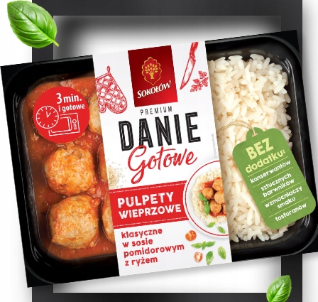Фрикадельки 42% (свинина 83%, вода, борошно пшениця, картопляний крохмаль, пшениця безглютенова клітковина, сіль, спеції, цукор), варений рис 39% (вода, рис 32%, сіль), соус 19% (помідори) (39%), томатне пюре (26%), вода, цибуля ріпчаста, морква, олія рапсова, крохмаль кукурудзяний, цукор, спеції.