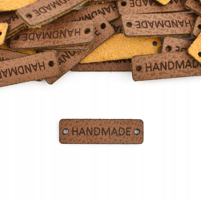 Бирка з написом "Handmade" і двома отворами для пришивання.