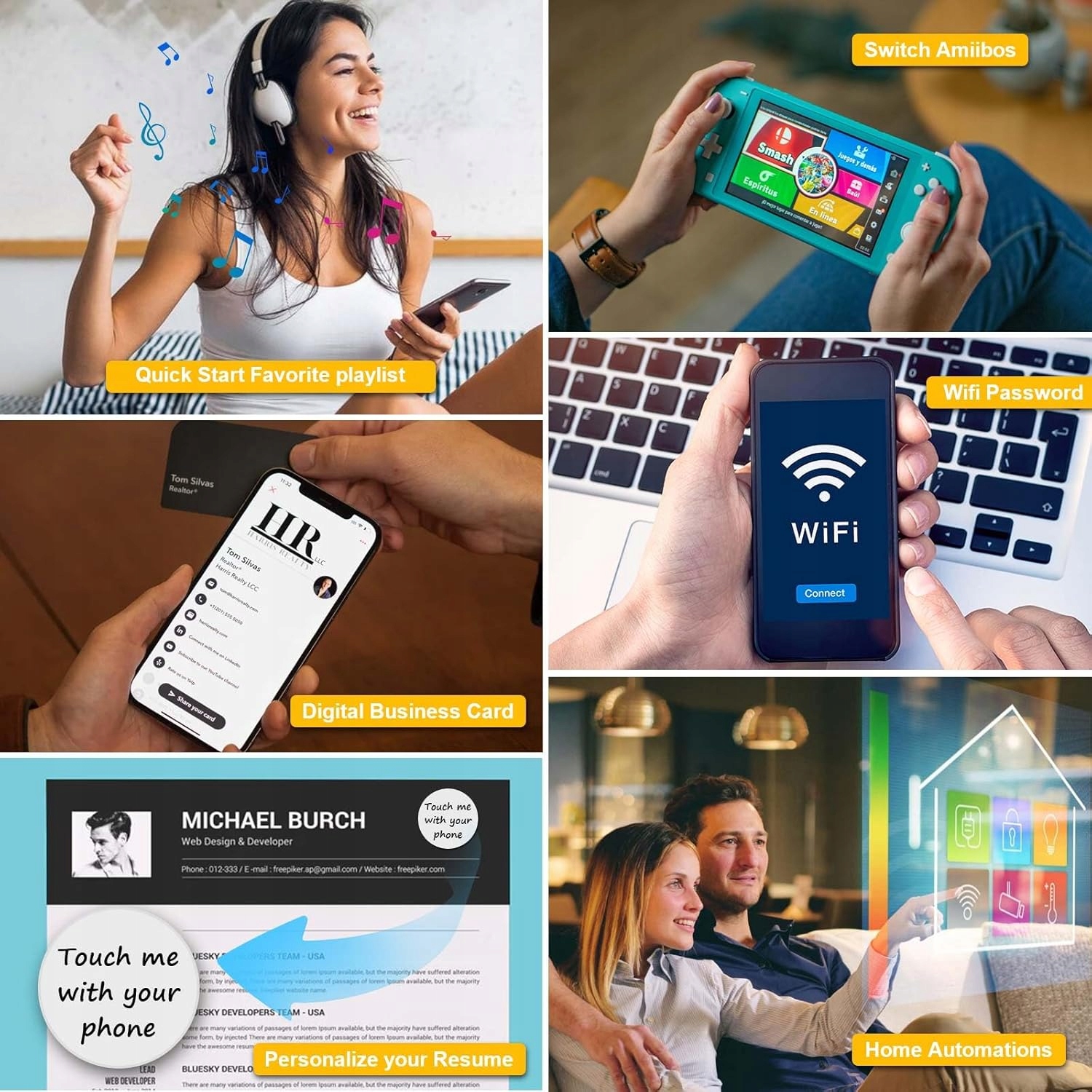 Широке застосування: сумісний із TagMo та більшістю телефонів і пристроїв Android із підтримкою NFC, ви можете легко написати тег NFC і створити тегмо для будь-якої зброї, домашньої тварини, скакуна чи модного предмета. Швидко діліться повідомленнями в соціальних мережах, музикою, підключайтеся до Wi-Fi, візитною карткою, URL-адресою, текстом, безпекою, цілями автентифікації тощо. Картки NFC можна перезаписувати, що означає, що їх можна використовувати кілька разів для зберігання різних даних та інформації.