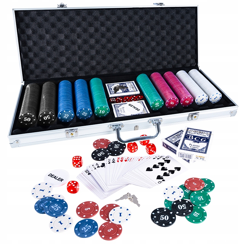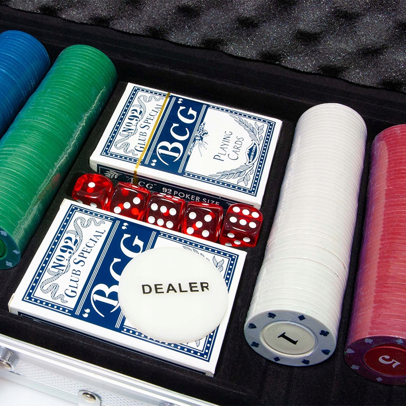 Професійний надійний набір для покеру чи кубиків. Дві колоди карт, набір кубиків і 500 ігрових жетонів, упаковані в елегантну коробку. Містить усі елементи, необхідні для гри в покер, крепс або блекджек: дві колоди карт, набір кубиків, жетон дилера - ДИЛЕР.