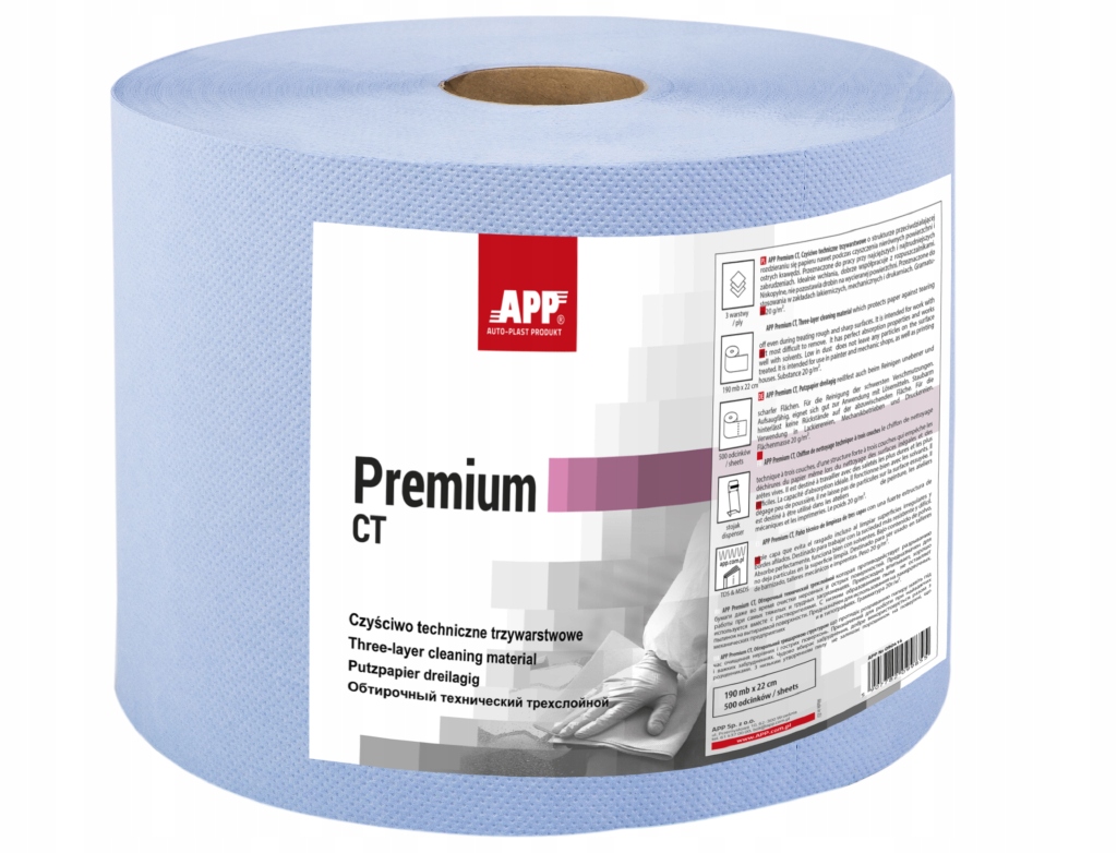 Технічна тканина для чищення з целюлози APP Premium – це тришарова тканина для чищення з тисненням, яка має дуже високу механічну міцність у вологому стані та дуже низький рівень пилоутворення. Призначений для використання в фарбувальних установках для остаточного очищення поверхонь перед фарбуванням. На механічних заводах і друкарнях. Для миття та витирання інструментів, робочих столів або рук.