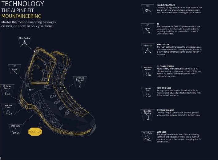 Система живлення 3F – безперечно ідеальне поєднання гнучкості, стабілізації стопи та точного прилягання до стопи. Система, створена Salewa, яка використовує сталевий трос для забезпечення додаткової стабілізації задньої частини стопи. На відміну від інших систем цього типу, вона не обмежує рухи користувача. Рішення системи живлення 3F забезпечує рухи в повному фізіологічному діапазоні, поєднуючи гнучкість і стабілізацію одночасно.