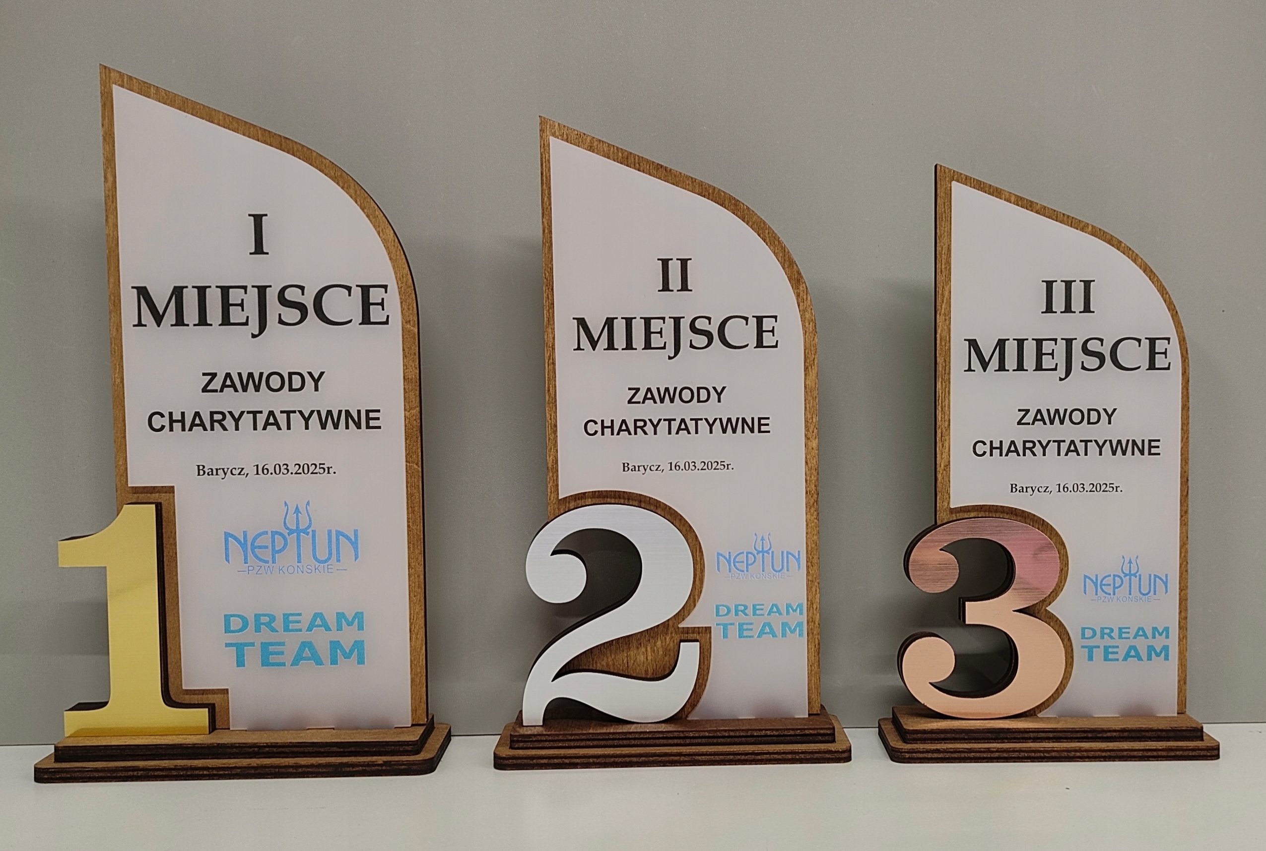 статуетка / трофей для третього місця. Оригінальна, красива та унікальна статуетка, виготовлена з комбінації фанери, замороженого оргскла з кольоровим ультрафіолетовим друком. Крім того, тривимірний номер 3 коричневого гравірування ламінату завершує ціле.