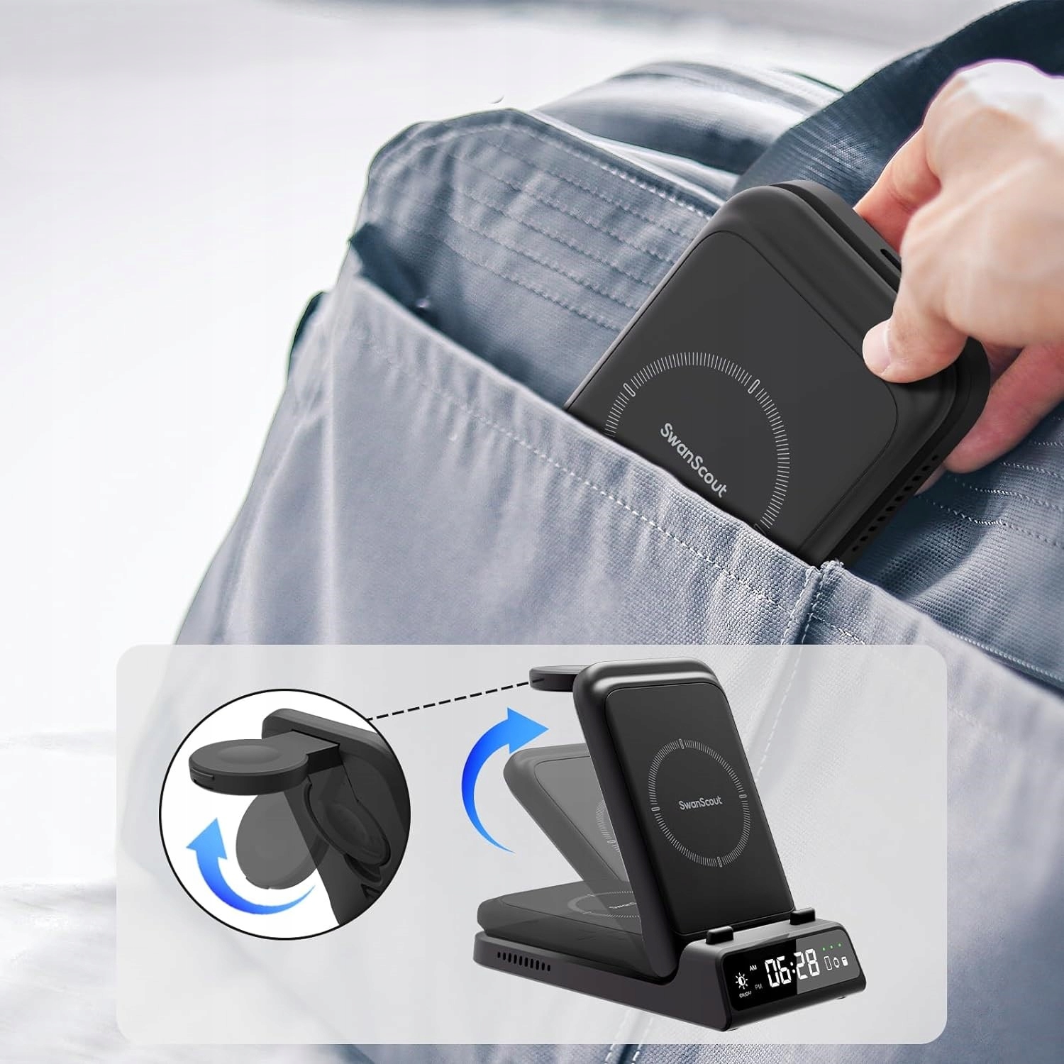 Бездротова зарядна станція SwanScout складається і легко поміщається у вашу дорожню сумку. Все, що вам потрібно, це один зарядний кабель і один зарядний пристрій для 3 пристроїв.