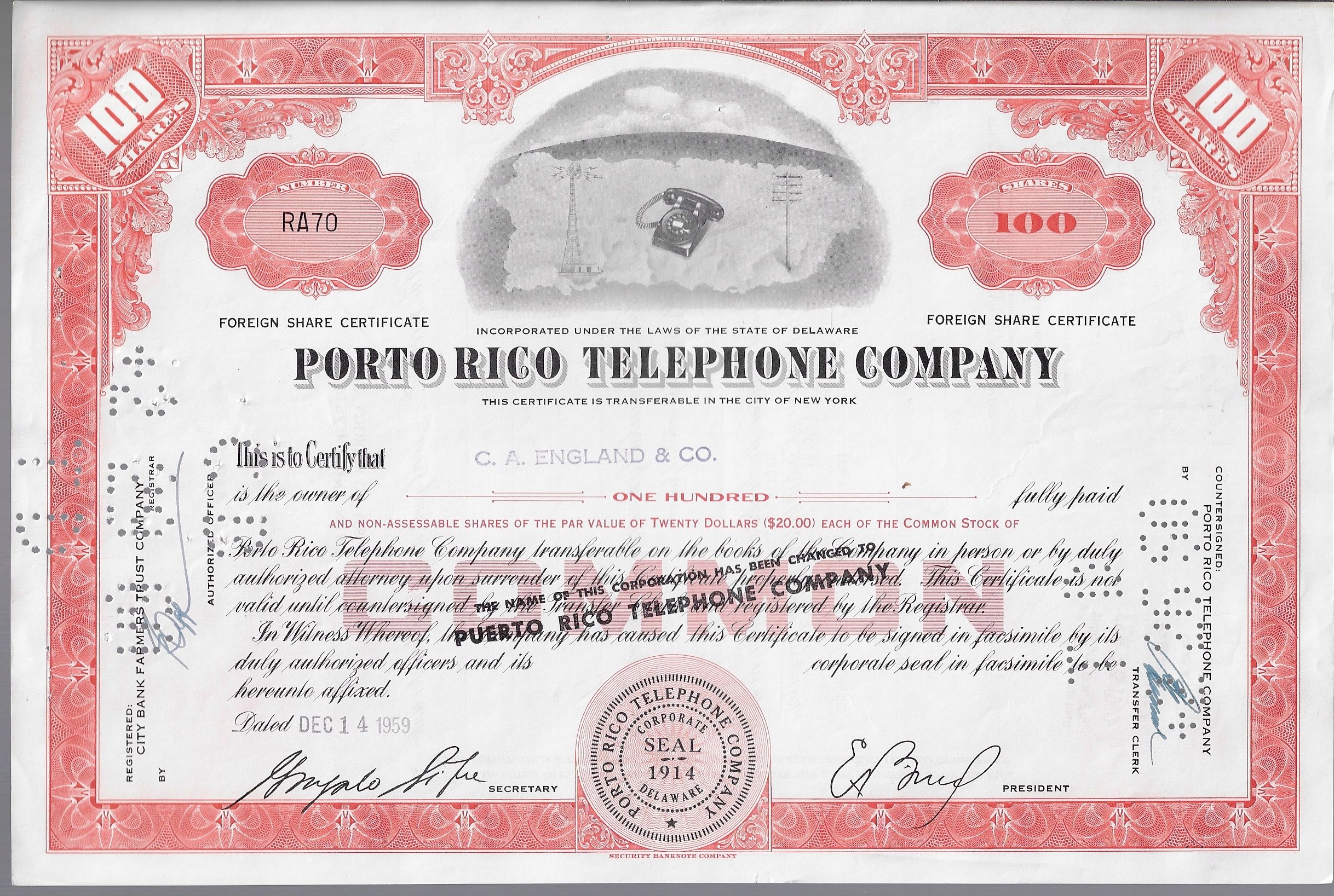 Заказывая «Porto Rico Telephone Company 1959 Action / Bond» данное изделие из «цінні папери» вы можете быть уверены, что после оформления заказа, доставки в Украину, вы получите именно то, что заказывали, в оговоренные сроки и европейского качества.