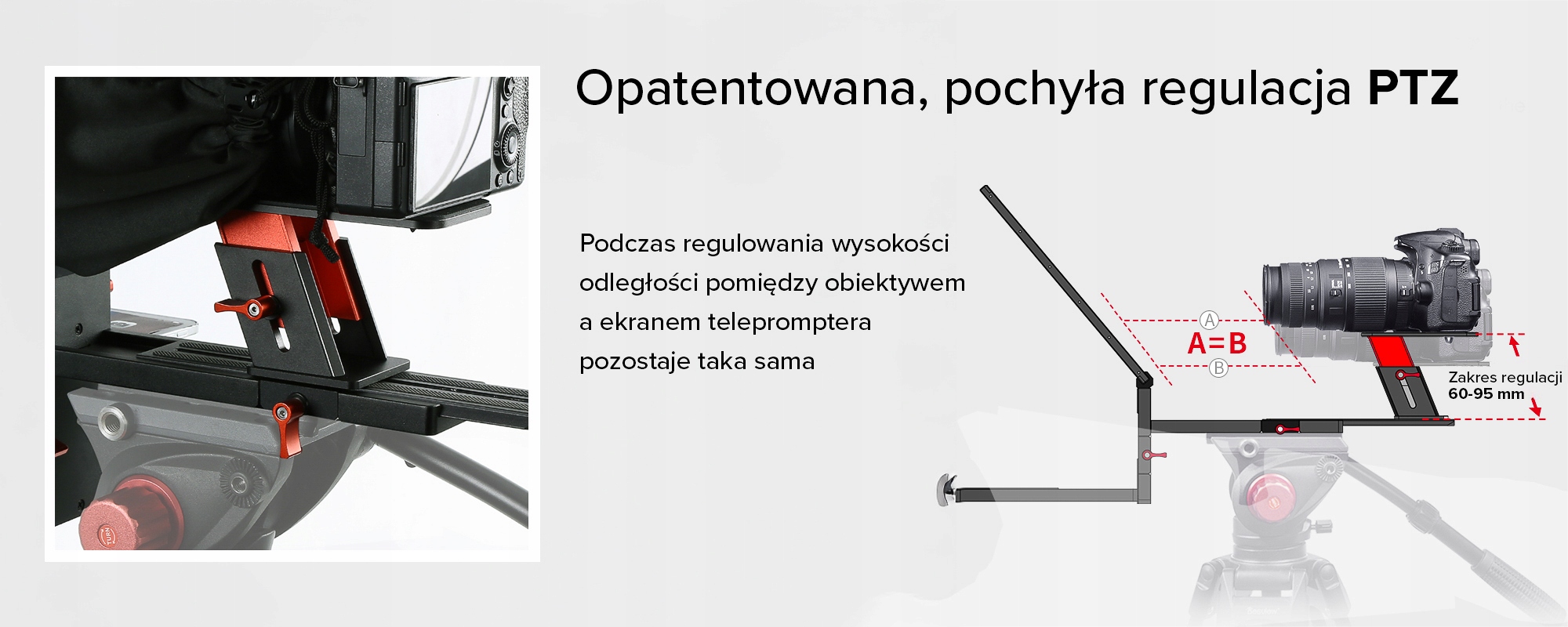 Desview TP170 оснащений запатентованим, нахиленим механізмом підйому PTZ, який дозволяє регулювати положення камери вертикально, не змінюючи відстань між лінзою та дзеркалом Teleprompter. Завдяки цьому ви можете вільно виправити налаштування, не турбуючись про втрату фокусу чи спотворення зображення. Ця інноваційна система забезпечує більшу гнучкість під час записів, що забезпечує точне налаштування кадру.