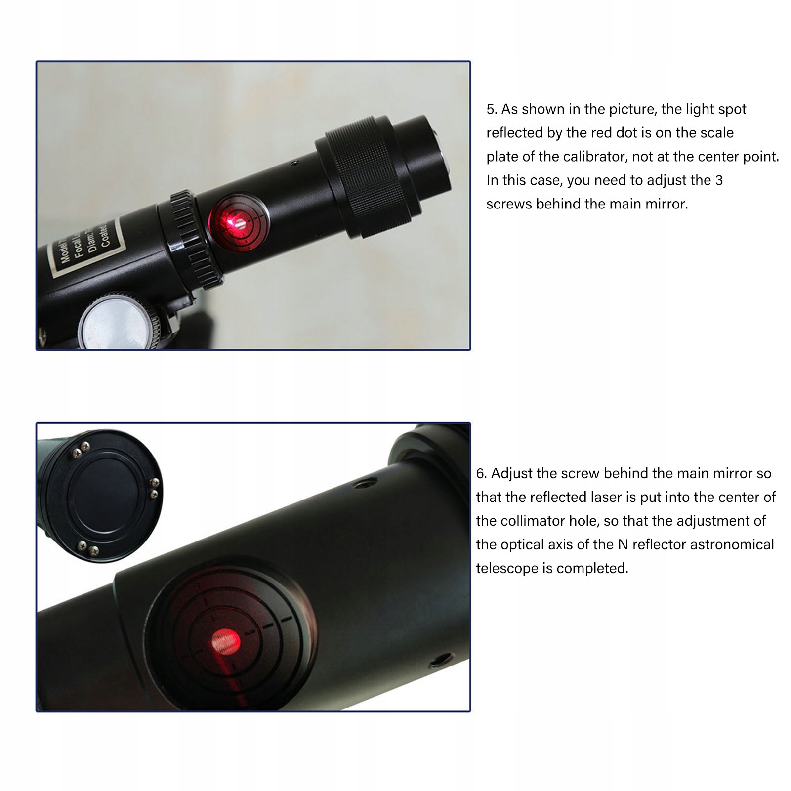 4. Простий у використанні та використання: Цей телескопічний коліматор простий у використанні, точна калібрування за кілька хвилин, забезпечуючи кращий вигляд та зображення з дзеркальним телескоп, а також простий у використанні, просто спостерігайте за положенням червоної калібраторної крапки з кінця об'єктива та регулюйте відповідний гвинт.