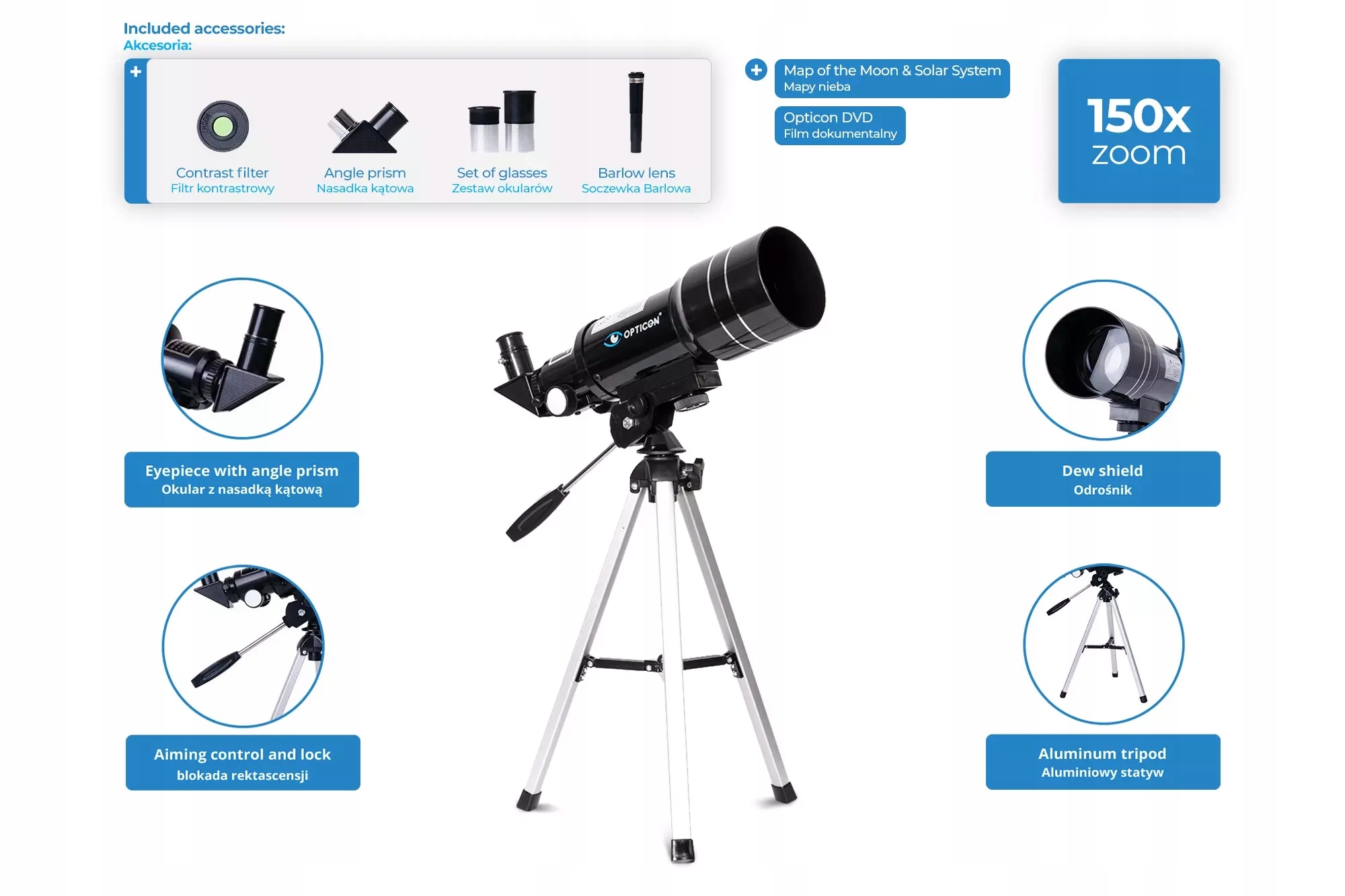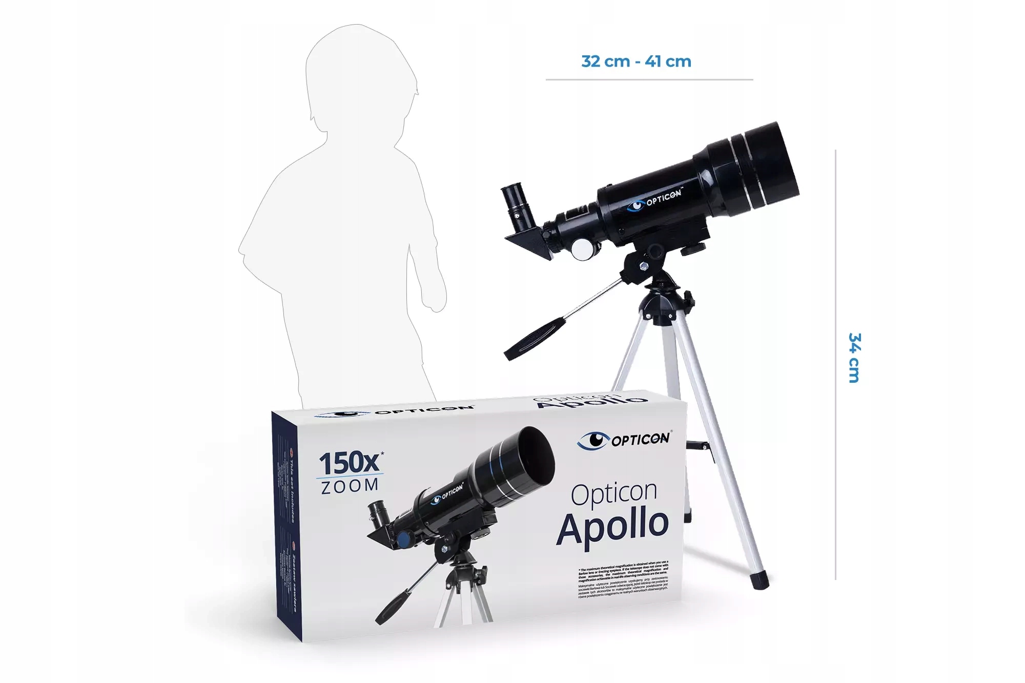 The Apollo Телескоп 70F300AZ оснащений дуже великим об'єктивом, завдяки якому ми можемо бачити яскраві, чисті та контрастні зображення навіть далеких космічних об'єктів. Така велика лінза також забезпечує широке поле зору, що значно полегшує спостереження, оскільки дозволяє бачити більшу частину неба. У комплект телескопа також входить спеціальний фільтрдля спостереження за Місяцем. Це дуже корисний інструмент під час повного місяця. Завдяки йому краще видно деталі поверхні Місяця – кратери, моря та гори.