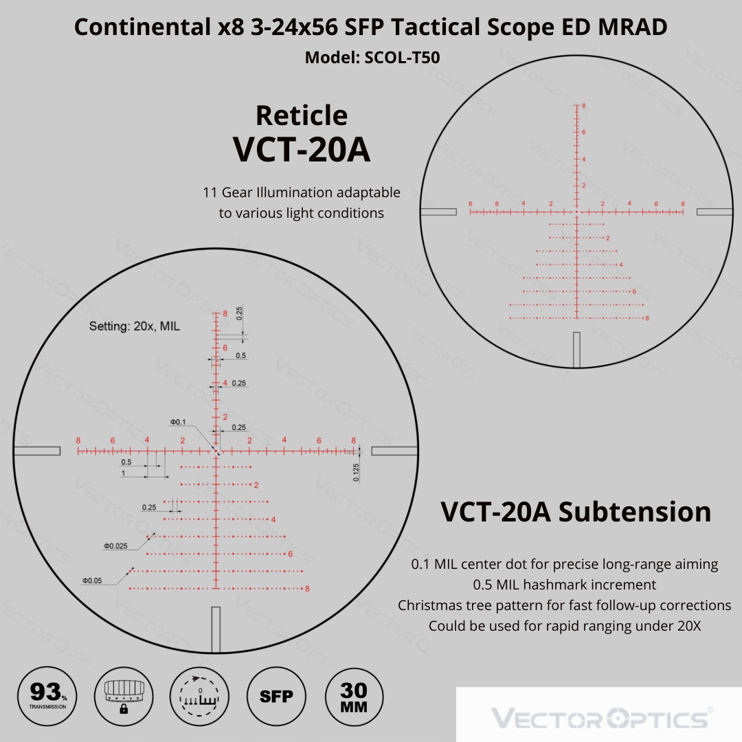 Вигравірована сітка VCT-20A (різдвяна ялинка) розташована у другій фокальній площині (SFP). Деформація мішені VCT-20A забезпечує точну стрільбу на великі дистанції, швидку корекцію при повторних пострілах, застосування тактичної та спортивної стрільби (наприклад, PRS, стрільба по рухомих або кількох цілях, застосування на дальньому полюванні). Ця навчальна програма потребує певного досвіду та тренувань, щоб максимізувати свої здібності, але в руках досвідченого стрільця вона забезпечує неперевершене поєднання точності та швидкості.
