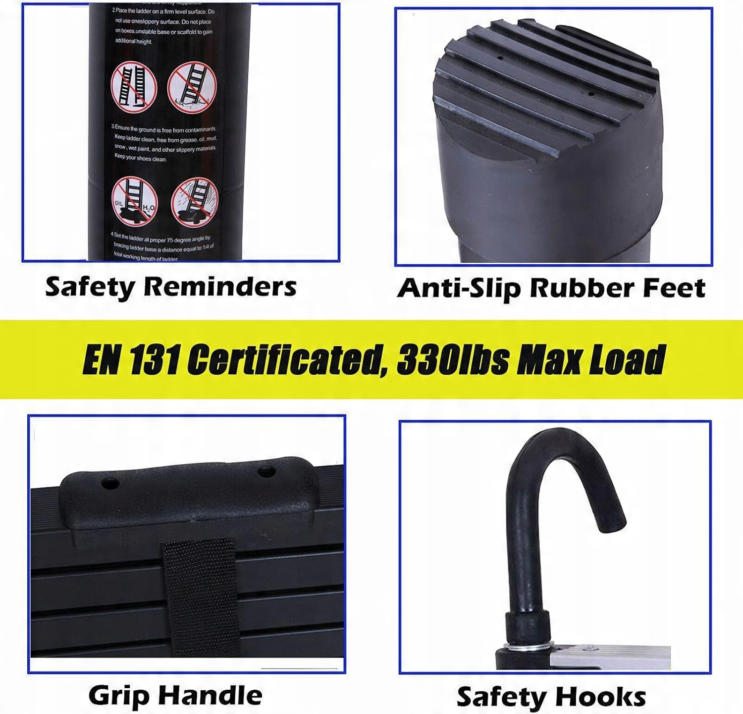 - ▶ Безпечний і компактний: телескопічна драбина оснащена 2 знімними гачками для безпечного кріплення. Виготовлений з міцного алюмінію, оснащеного промисловими засувками, що блокує висоту та тверді, не -ковзаючі гумові ноги на дні драбини. Телескопічна драбина відповідає стандарту безпеки EN131.
