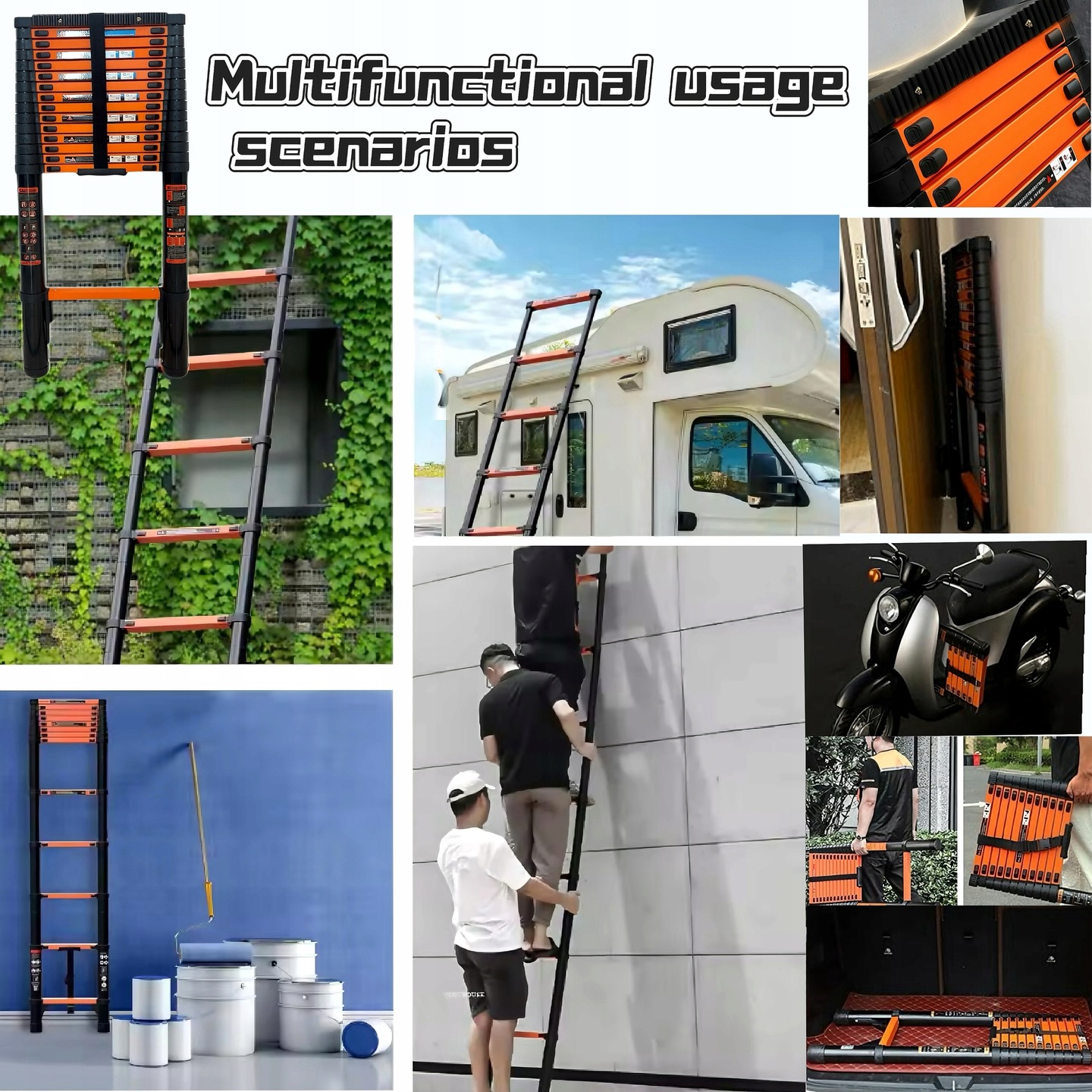 . 【Новий дизайн Hooha】Наші драбини були спеціально розроблені в трьох розмірах: 3,9 м, 5,1 м і 6,3 м. Виготовлені з абсолютно нового матеріалу з вуглецевої сталі, ці драбини пропонують більшу стабільність і довговічність, здатні витримувати до 150 кг. Підходять як для внутрішнього, так і зовнішнього використання, вони ідеально підходять для різноманітних ситуацій, таких як обрізка рослин, доступ до горищ, заміна лампочок, миття вікон, фарбування та ремонт даху. Наші телескопічні драбини ідеально підходять для будь-якого сценарію, де потрібна драбина, роблячи ваше життя комфортнішим і зручнішим.