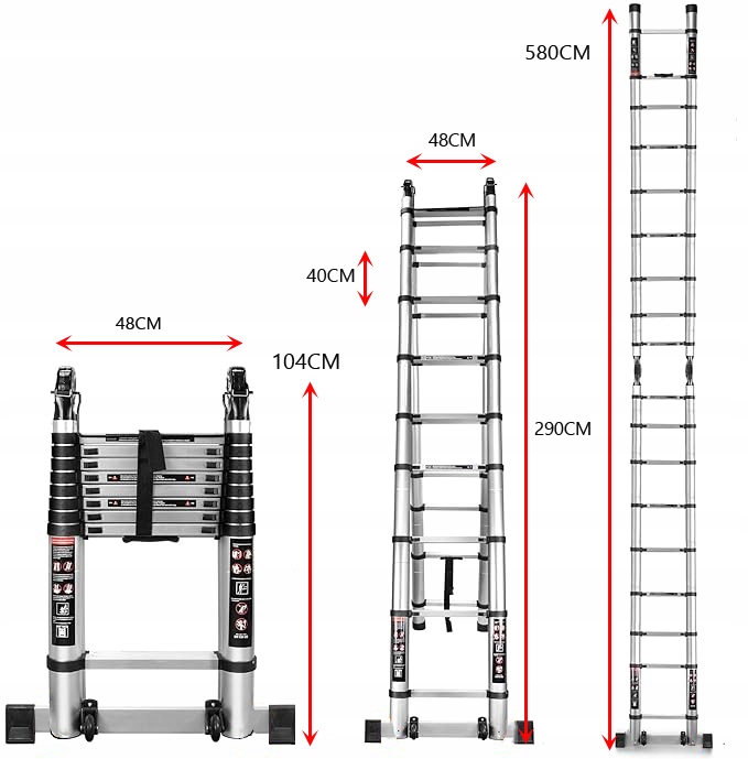 ① Телескопічна драбина виготовлена з алюмінію промислового класу, з твердими ногами з гумою та сертифікованою відповідно до стандартів безпеки EN131.